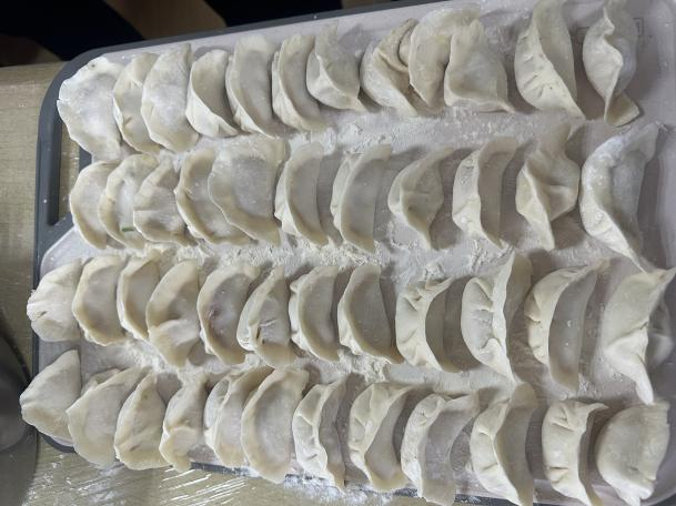 在一片欢声笑语中,饺子“大军”的规模不断壮大,有元宝形的,有月牙形的,还有特殊的“小船形”的,不管饺子的形状有多少种,都寄托着大家对于冬至节日满满的祝福。