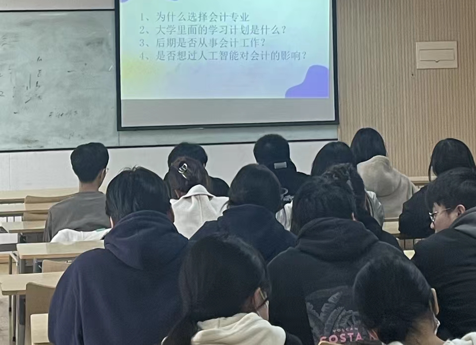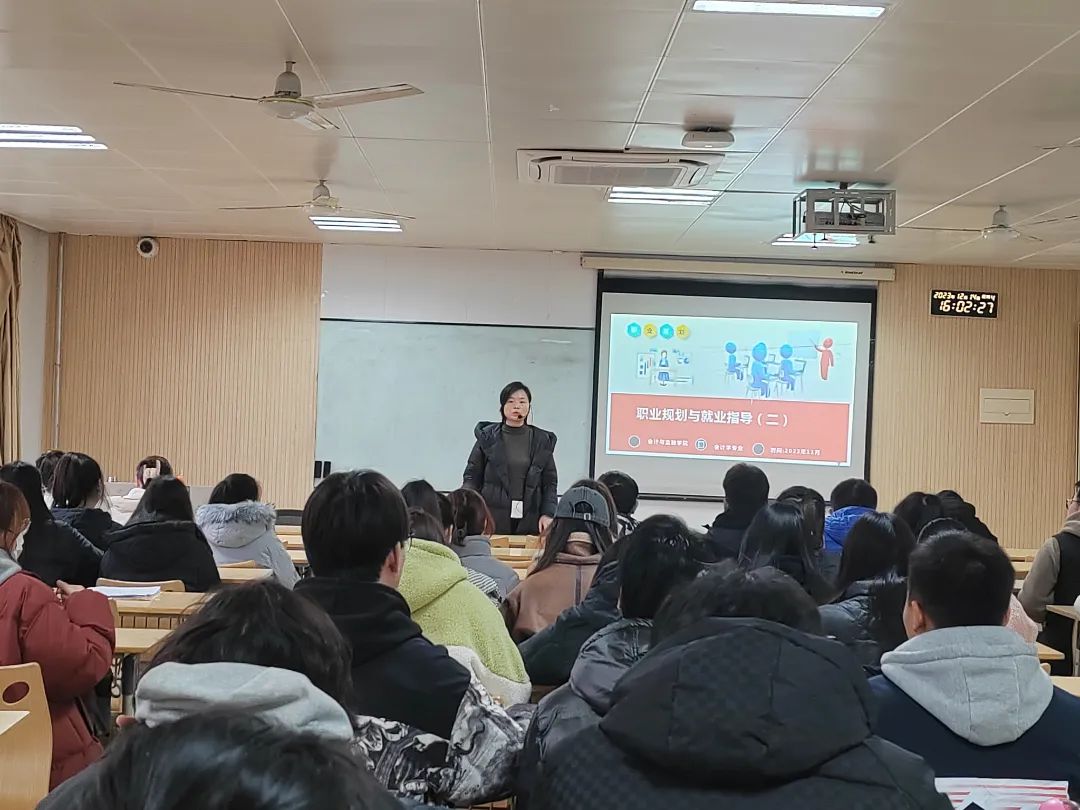 首先分析会计学专业的就业形势和前景,从近些年人社部调研报告中显示,会计专业仍属于求职“最缺工”100个职业排行榜中,说明企业还是对会计人才有所需求,但是随着人工智能的发展,目前对高端会计人才的需求更为迫切,例如财务BP;所以建议同学们在学习课本知识的同时,多学一些智能财务类的软件,有利于将所学的知识融会贯通;其次又分析会计专业的就业领域,与其他专业对比会计的就业面很广,不像互联网等行业就业存在大批量波动;但是会计人员的工资比较低,工作有时候也很繁琐,尤其是在年底和月初、月底都比较忙,建议同学们可以开阔视野,从事与会计相关的工作,如:在事务所或银行工作;最后,老师们结合自己多年的企业从业经历,鼓励同学们从大学二年级开始就制定自己的职业生涯规划,若有些同学要考公或者考研,也要趁早着手准备,在学校期间结合个人实际情况与设定的目标确定适合自己的职业方向,并努力提升自己的专业技能,考取会计类专业证书,参加各种学科类竞赛和社会实践,丰富自己简历。在整个授课过程中,两位老师与学生充分互动,了解学生的实际需求和内心想法,帮助学生们树立正确的求职观念,同学们也根据要求完成了自己的职业生涯规划报告。