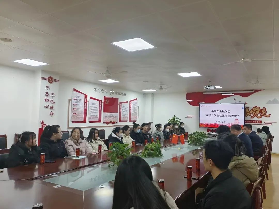 寒冬送暖,“研”途相伴。2024年国家硕士研究生招生考试开考在即,为进一步发挥一站式学生社区育人功能,帮助考研学子缓解备考压力,坚定考研信心、积极冲刺迎考,2023年12月11日,会计与金融学院“至诚”学生社区在博远楼2115会议室召开了考研慰问座谈会。学院党委书记兼行政副院长史立军、党委副书记刘斌、学生干事王迪、学生干事张峰涛、辅导员赵娅楠、赵琦及考研学生代表参加了此次座谈会。