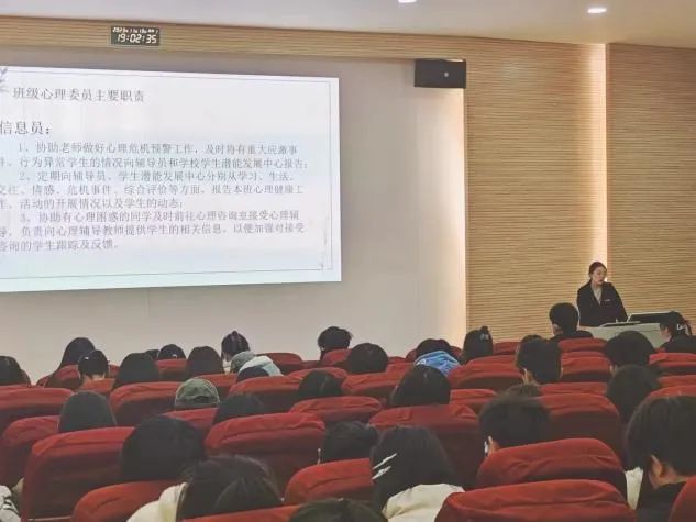 接着,学院学生潜能发展辅导站赵娅囡老师从心理委员的素质与要求、心理委员的职责、心理委员工作的方法与途径以及心理危机干预等方面出发,详细的讲解了心理委员如何去开展工作,以及如何能够识别身边有心理危机的同学和如何去帮助他们,希望所有心理委员找准定位,做好工作,做同学们的知心伙伴。同时,强调了心理委员作为同学与心理咨询师之间的桥梁,要承担起老师与同学之间的联络员。最后他还强调,作为心理委员一定要自己保持良好的心理状态和调整方法,从而能够更好的发挥心理委员的朋辈帮助作用。