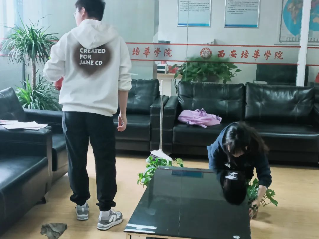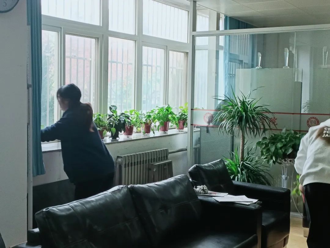 教学楼中,学生们忙碌的身影穿梭其中,他们各司其职,有的用抹布清洁桌面、窗户和桌椅,有的用扫帚清理地面,有的浇灌养护花草,将卫生清洁落到实处,践行着“时时勤拂拭,勿使尘埃染”的理念。
