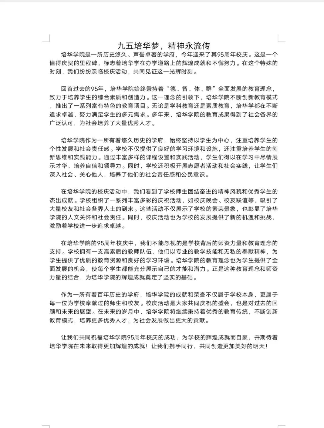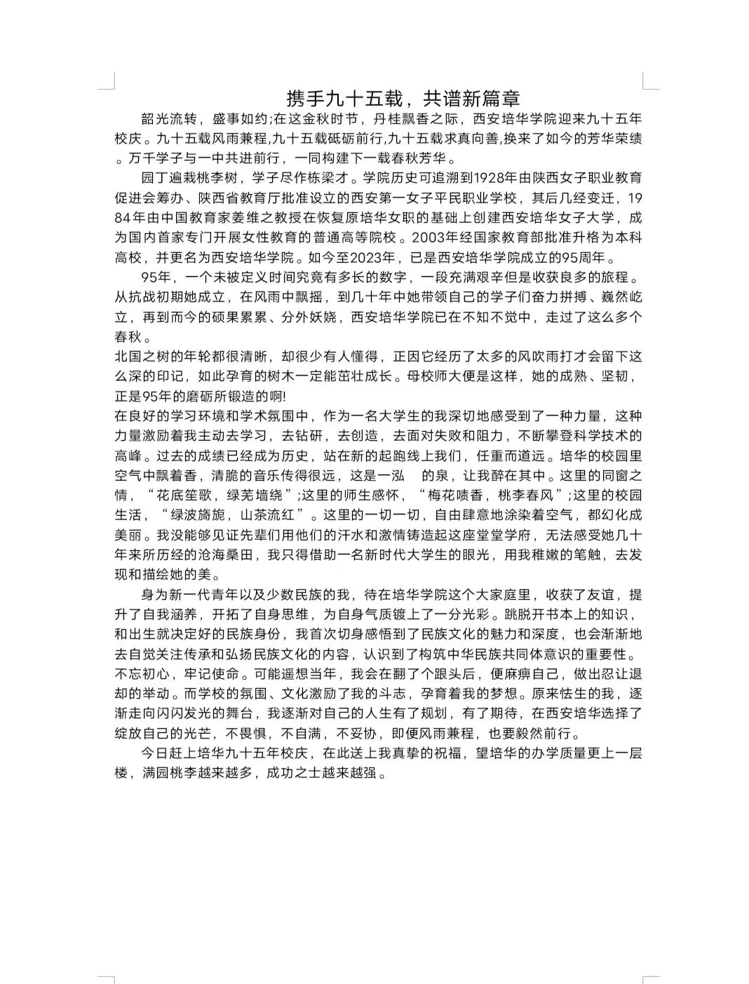 此次活动收获满满,收获了一篇又一篇的优秀征文,字里行间流露出学生们对学校九十五周年的祝福,优秀作品展示如下: