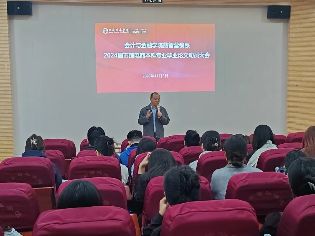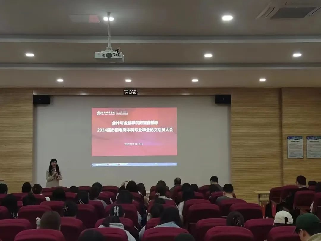 2023年11月3日下午2点在博远楼J202教室,会计与金融学院数智营销系召开2024届市场营销、电子商务专业毕业论文动员大会。本次动员大会由电子商务专业王艳老师主持并介绍了2024届毕业生情况,本次会议由数智营销系全体教师及2024届市场营销、电子商务专业全体预毕业生参加。毕业论文不仅能展示学生们的学术素养,还是他们在市场营销和电子商务领域所获知识的结晶。这次大会将为学生们提供启发和指导,激发他们为论文的成功付出努力的动力。