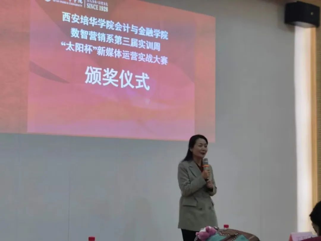 西安培华学院会计与金融学院数智营销系于2023年10月27日周五下午14:00在博远楼J202举办第三届实训周“太阳杯”新媒体运营实战大赛决赛,该活动旨在推动学生在新媒体领域的创新和发展。本次比赛由市场营销专业的王静芝和庞嘉洋同学共同主持。主要参会人员有西安太阳食品有限责任公司董事、行政总监王磊峰,西安太阳食品有限责任公司电商部门相关负责人、西安培华学院会计与金融学院院长赵选民,行政副院长史立军以及副院长丁阳,数智营销系电子商务、市场营销专业全体教师和学生。此次比赛为数智营销系的学生们提供了一个展示他们数字营销技能的舞台,共同见证了这一数字时代的营销盛事。