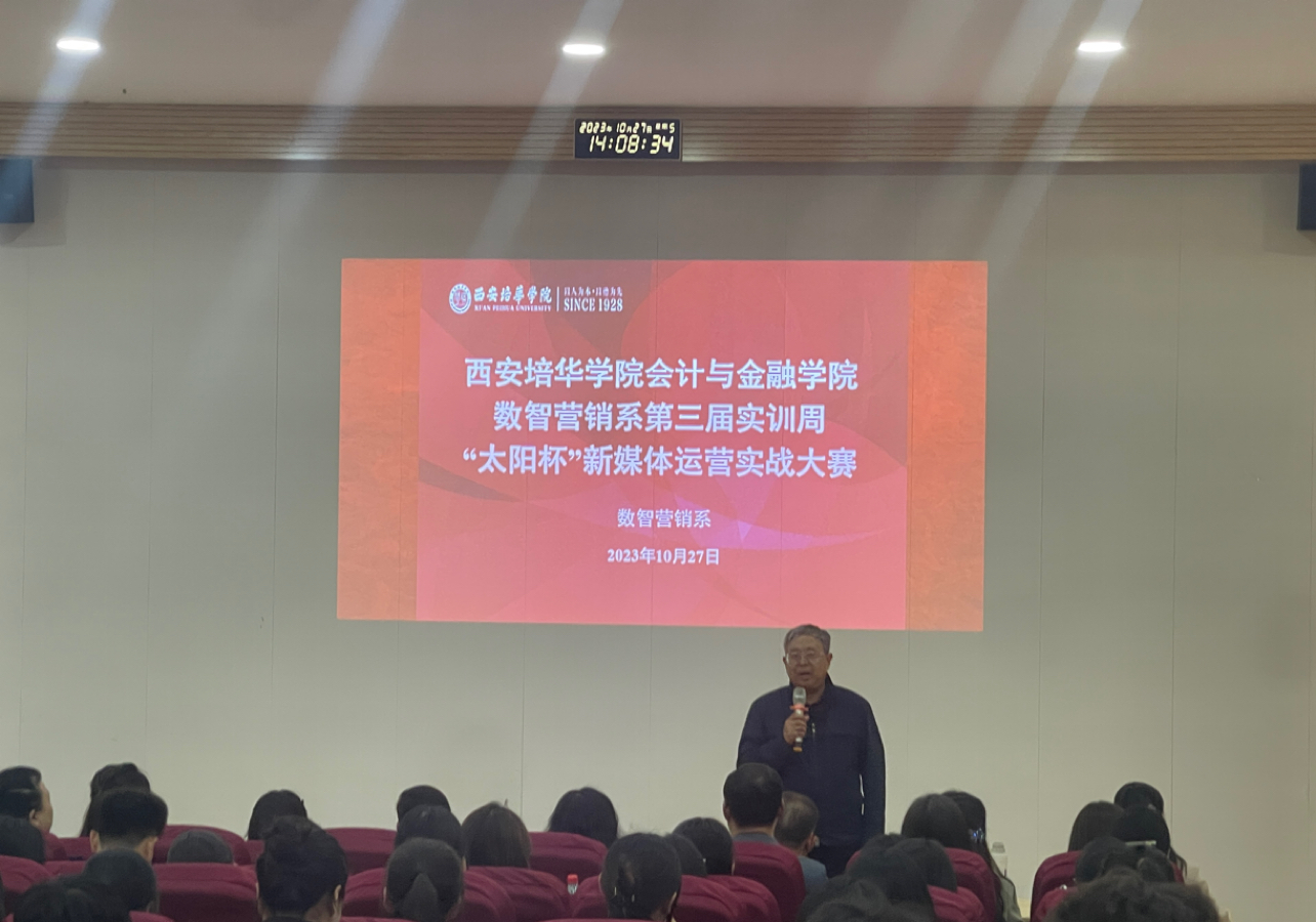 西安培华学院会计与金融学院数智营销系于2023年10月27日周五下午14:00在博远楼J202举办第三届实训周“太阳杯”新媒体运营实战大赛决赛,该活动旨在推动学生在新媒体领域的创新和发展。本次比赛由市场营销专业的王静芝和庞嘉洋同学共同主持。主要参会人员有西安太阳食品有限责任公司董事、行政总监王磊峰,西安太阳食品有限责任公司电商部门相关负责人、西安培华学院会计与金融学院院长赵选民,行政副院长史立军以及副院长丁阳,数智营销系电子商务、市场营销专业全体教师和学生。此次比赛为数智营销系的学生们提供了一个展示他们数字营销技能的舞台,共同见证了这一数字时代的营销盛事。