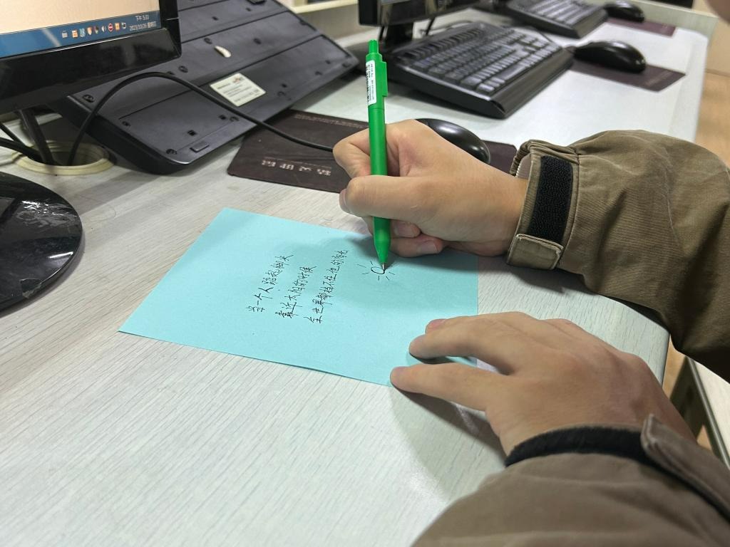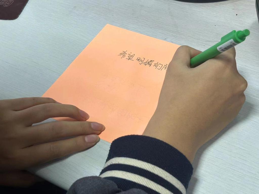 小小一张纸上写的也许是近期的烦恼,也许是一段给大家的温暖祝福,它承载着的是心语心愿,大家一起把这张满满字迹的纸片折成纸飞机。