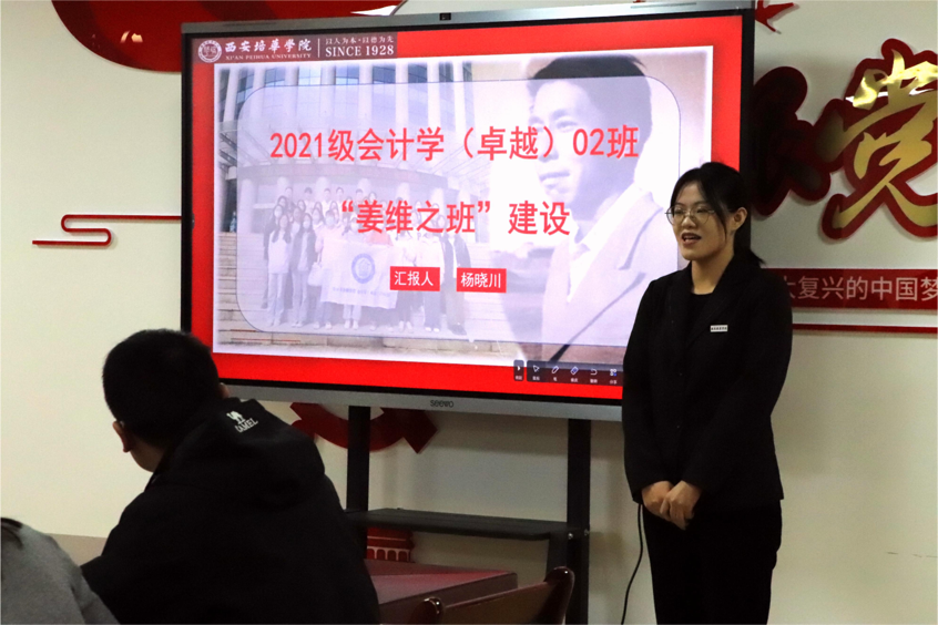 会议第二项由“姜维之班”创建班学生代表汇报班级创建情况。2021会计学(卓越)02班杨晓川同学和2020会计学04班郭若苛同学分别对班级创建情况进行汇报,他们重点讲述了各自班级的创建举措和创建成效,明确下一步班级创目标并作出创建规划,通过进一步加深班级同学对姜维之精神的认识,建立班级“分小组”创建机制,保证班级创建工作高效推进,最终实现班级学生专业知识水平和个人综合能力的不断增强。