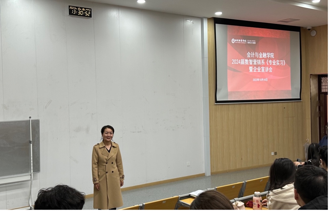 10月18日下午13:00,西安培华学院会计与金融学院数智营销系在育英楼3502教室召开了2023年度市场营销与电子商务专业实习动员大会暨企业双选会。此次大会由数智营销系主办,旨在为学生们提供走向社会,对接实践的宝贵机会。活动邀请了会计与金融学院副院长丁院长、专业带头人杨柏欢教授、石妍教授,以及数智营销系的各位老师,特别是8家知名企业的代表莅临现场,分别是深圳市酒海实业有限公司代表杨清亮、西安皓唐国际酒店代表李永忠、旷世传声传媒科技有限公司代表阎萌、陕西博德网络传媒有限责任公司代表曹丹、西安金拱门食品有限公司代表郭文杰、百胜中国代表王钰佳、中国人寿保险有限公司西安分公司代表曹哲、中海地产代表郭超,共同为同学们的职业规划献计献策。