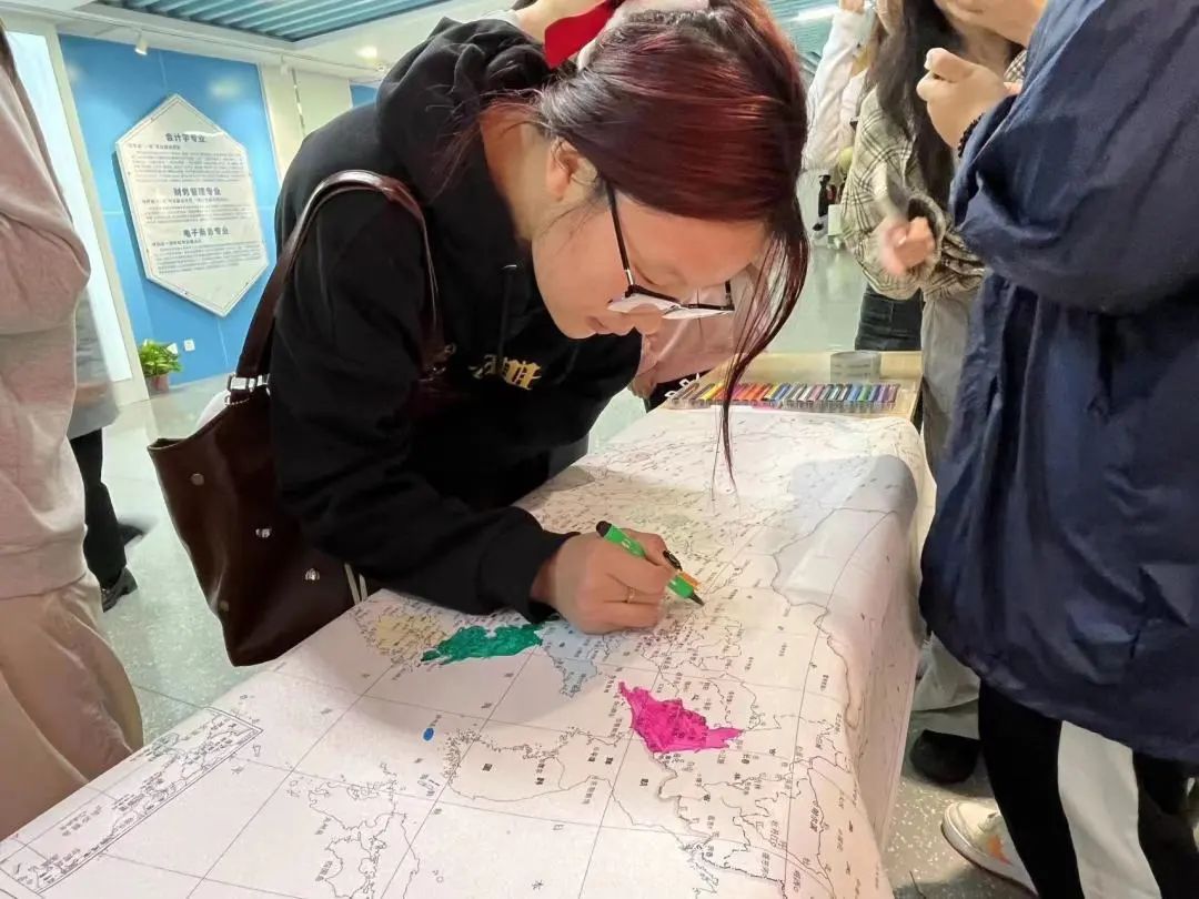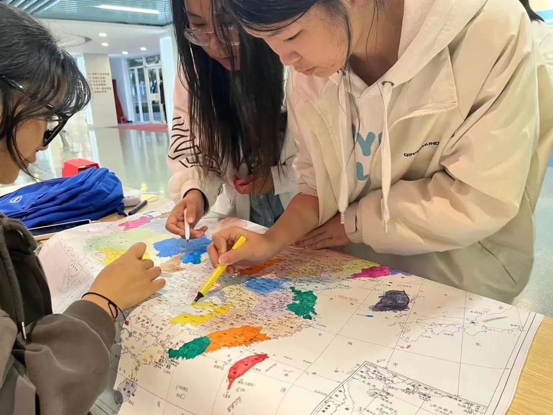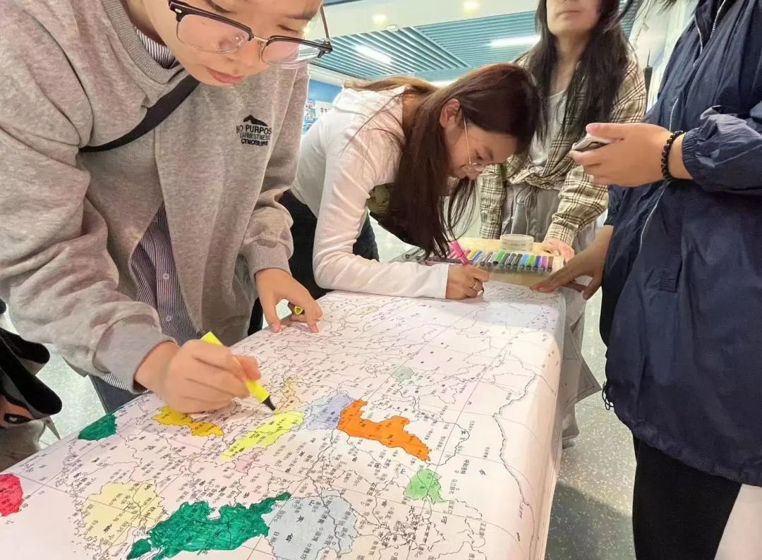 本次活动通过邀请来自不同省份的同学,在空白的中国地图上用彩笔填充地图颜色,使中国地图上各个省份逐渐充满色彩。同学们共绘祖国地图,展现了祖国广阔的环境,也以此祝祖国更加繁荣富强。