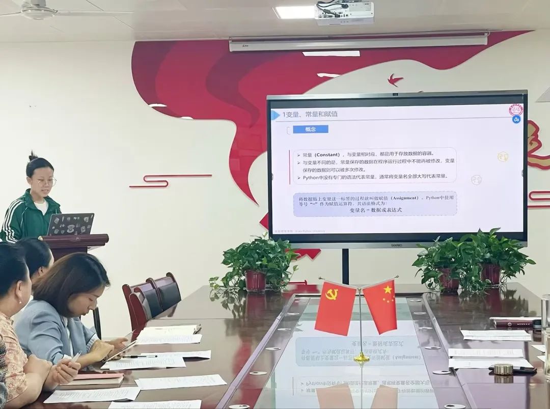 新进教师冯小溪针对“python入门基础”进行了20分钟的模拟授课,主要讲授了Python中的常量,变量以及赋值;python中变量(标识符)的命名规则、输入以及输出函数的使用等内容。赵院长指出,该教师能够熟练、有效地运用现代信息技术,教学手段多样,教学方法与时俱进。杨院长指出,教师授课要充分以学生为中心进行课堂设计。督导组组长刘心占老师提出,该教师授课能有效调动学生思维和学习积极性,课堂气氛融洽。考评小组给出如下建议:第一,PPT文字需放大。第二,授课语速需放缓。第三,加强实操部分的课堂设计。第四,“立德树人”要以学生为中心进行课堂设计。