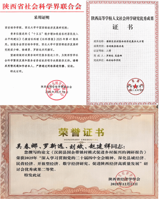 在科研获奖与成果应用方面,学院成效显著,成果质量与社会影响力持续提升。茹少峰教授、徐璋勇教授、罗新远教授共同撰写的决策咨询报告《“十五五”稳步增加我省农村居民收入水平的建议》被陕西省社科联《社科要报》2025年第41期采用,体现了研究成果服务省委省政府决策的咨政价值。罗新远教授、吴春娜教授完成的《灞桥区农村集体经济发展壮大方案》荣获陕西高等学校人文社会科学研究优秀成果二等奖。吴春娜教授、罗新远教授等撰写的调研报告《汉阴县国企带镇村模式促进乡村振兴的调研报告》在2025年陕西省经济学学会专题研讨会中获评优秀成果二等奖。此外,涂玉侠副教授的研究报告《基于高水平对外开放视角的陕西对外贸易风险评价研究报告》获得西安培华学院优秀科研成果奖二等奖。吴春娜教授主持完成的《汉阴县壮大集体经济及国企带镇村研究报告》获得西安培华学院优秀科研成果奖三等奖。这些成果的获奖与采纳,充分反映了学院在社会科学研究领域的学术水平、实践价值与政策影响力,展现了科研服务地方经济社会发展的重要贡献。