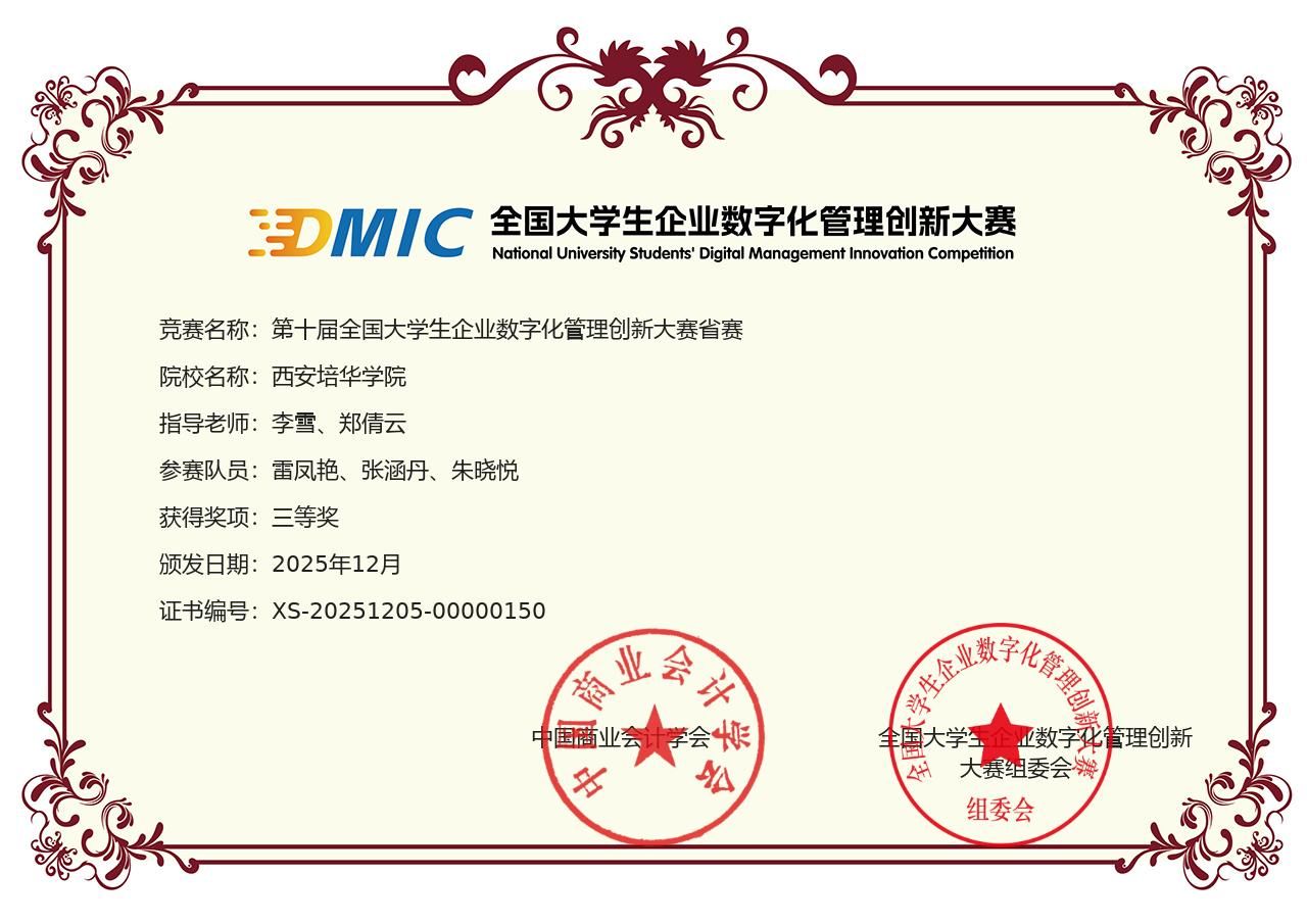 2025年12月第十届全国大学生企业数字化管理创新大赛(原金蝶云管理创新杯)完美落幕,2025年12月省赛成绩已出(省赛证书),我校会计与金融学院管理系李雪、郑倩云,共两位老师指导学生获得省级三等奖一项,充分展现了扎实的理论功底、敏锐的分析能力和良好的竞技风貌。