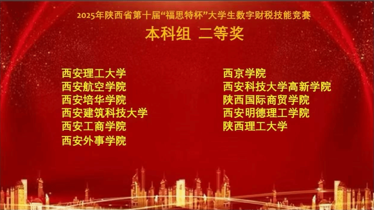 热烈祝贺会计学专业2025会计学专升本02班蔡天、杨阳、罗子豪、张依青四位同学在陕西省第十届“福思特杯”大学生数字财税技能竞赛本科组获得二等奖!