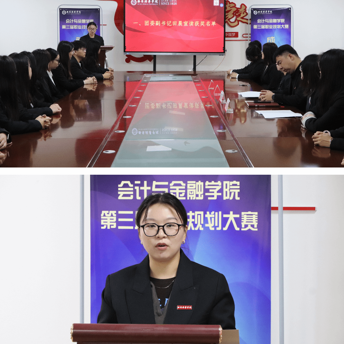 第一项议程,团委副书记田晨老师宣读获奖名单。田晨老师围绕“培养新时代金融财会领域高素质人才”的目标,阐述了成长赛道与就业赛道的评选标准及育人导向,强调职业规划既要立足个人成长,更要契合行业发展与国家战略需求,随后宣读各奖项获奖同学姓名,并加以鼓励。