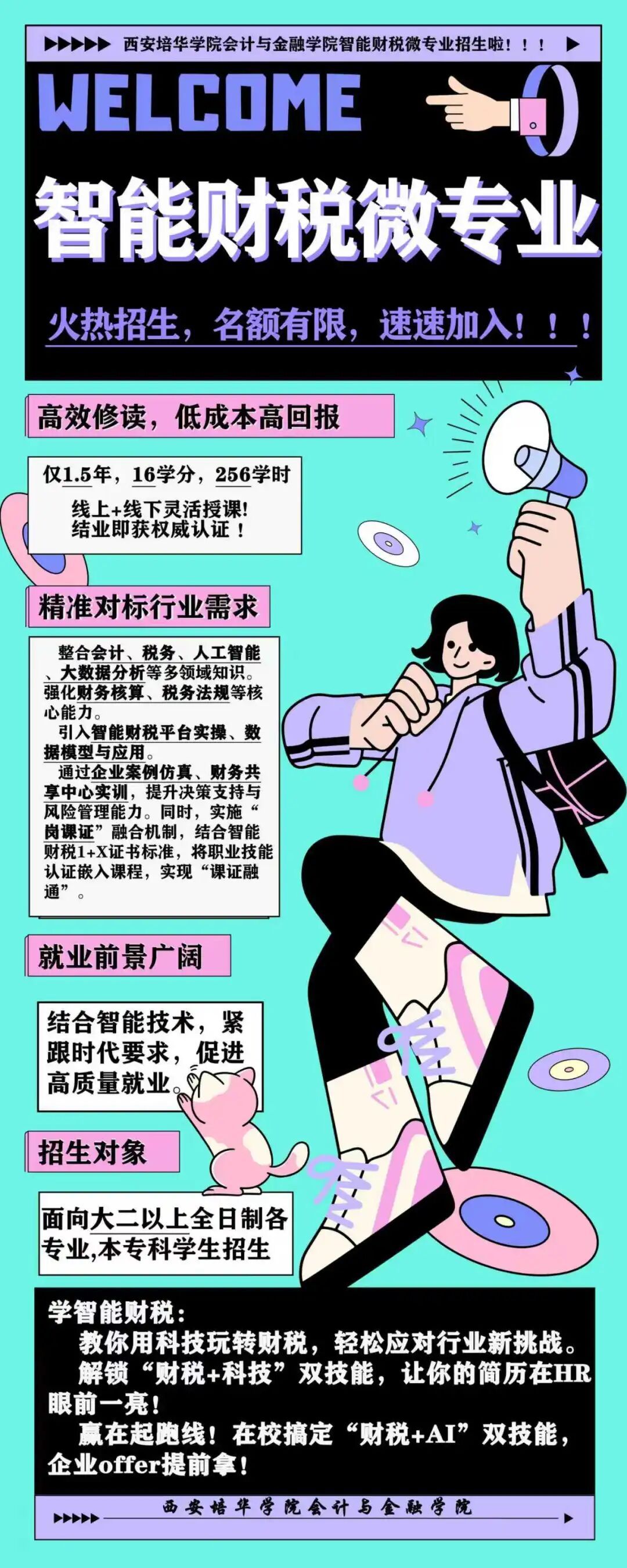 欢迎各位同学加入智能财税微专业!不会代码,也能开发机器人,不懂税务,也能预警风险,3个学期,毕业手握“税务师+数据师”双门票,让RPA替你打工,让大数据为你加薪!