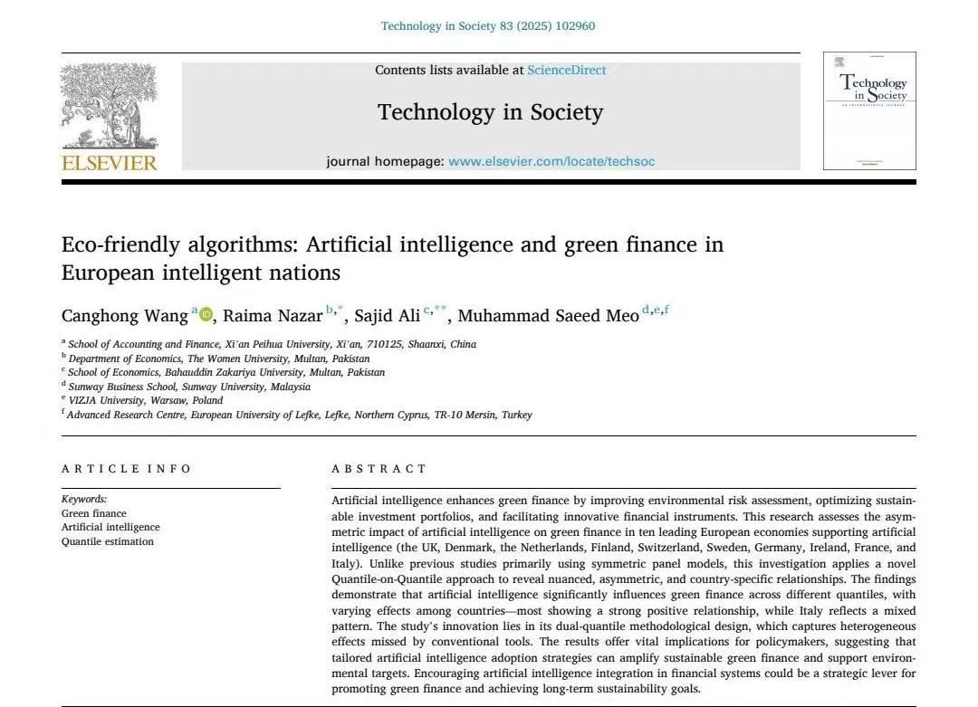 近日,西安培华学院会计与金融学院王仓红博士在SSCI收录期刊《Technology in Society》上发表了题为《Eco-friendly algorithms: Artificial intelligence and green finance in European intelligent nations》的学术论文,这是王仓红博士在该期刊发表的第二篇文章。该期刊在学术界享有较高声誉,位列JCR分区一区,中科院分区二区Top刊,2025年影响因子高达12.5分,其研究成果对于相关领域的学术发展和实践应用都有着重要的指导意义。