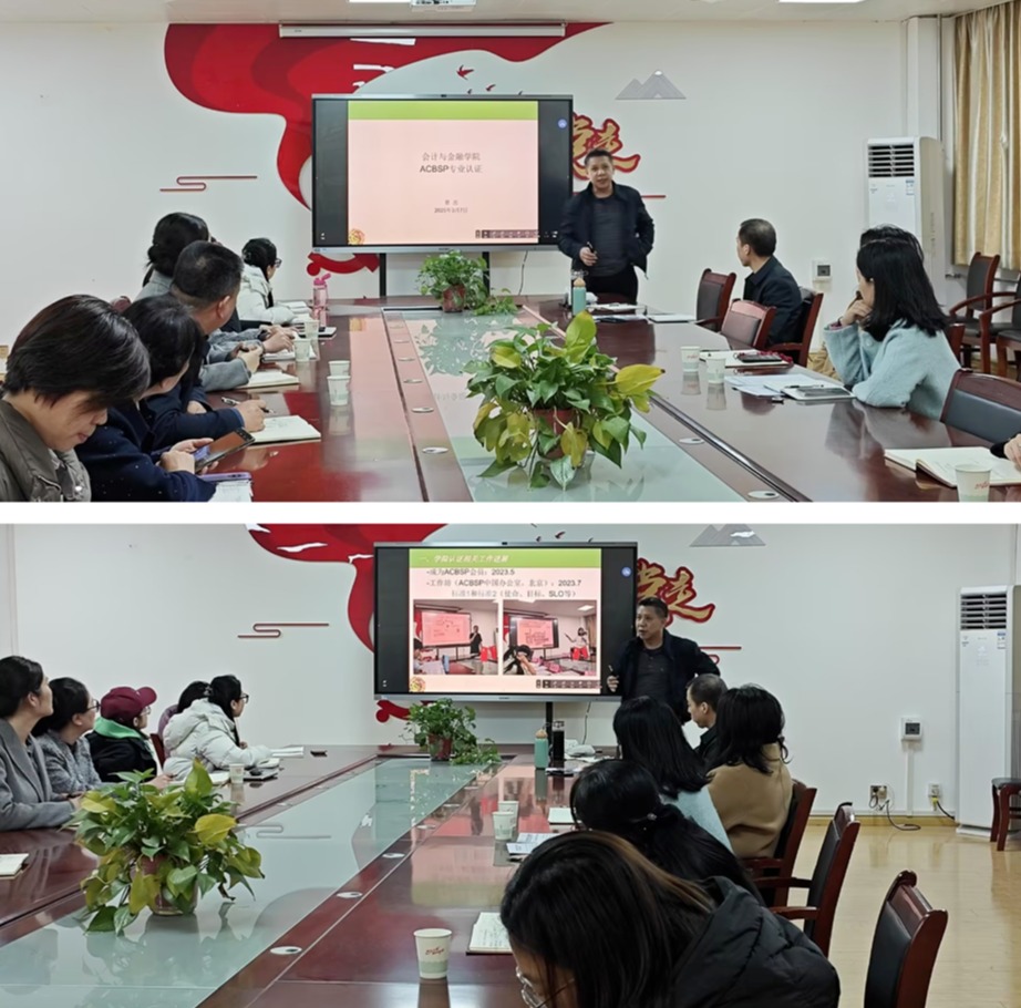 接着,覃忠教授分别从学院专业认证相关工作进展及近期工作计划两方面进行了汇报和部署。覃忠教授简单梳理了会计与金融学院参加ACBSP专业认证的过程;总结了近一年来取得的进展,特别是基础数据,包括学生两轮CPC测试、师资力量统计与课程教学大纲等方面;并针对基础数据和相关表格出现的问题提出了改进思路。专业认证工作的下一步重点包括基础数据的进一步完善,即将进行的学生和教师第2轮问卷调查,以及对应认证标准4的人才培养方案梳理,支撑毕业要求的课程教学目标的具体分解等。