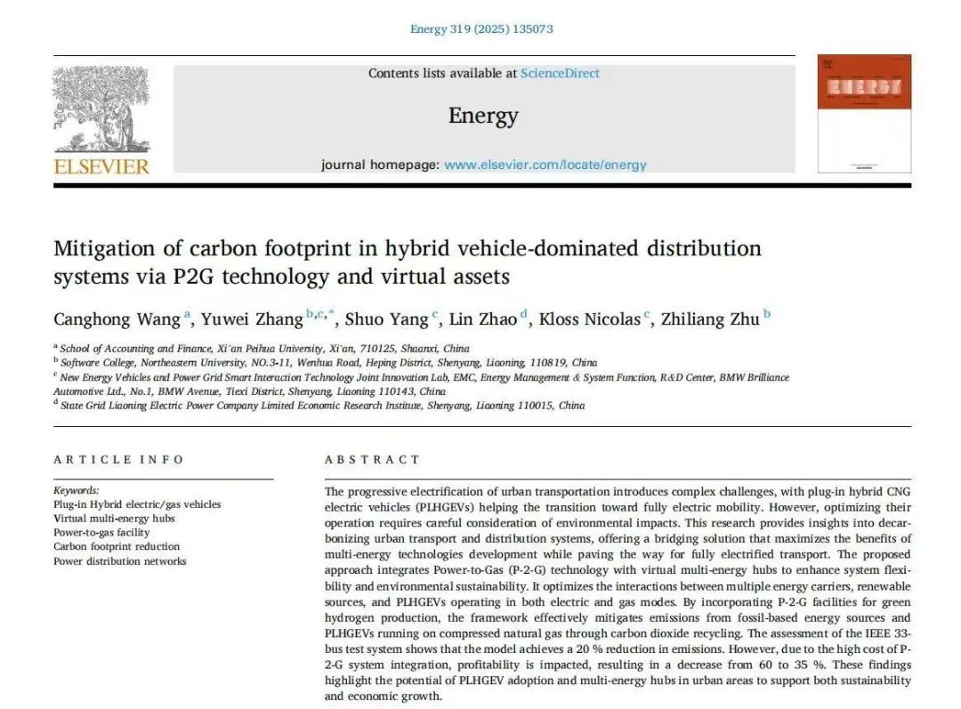 近日,我院王仓红博士作为第一作者,西安培华学院会计与金融学院作为第一署名单位的研究成果《Mitigation of carbon footprint in hybrid vehicle-dominated distribution systems via P2G technology and virtual assets》,在SCI收录期刊《Energy》发表,该期刊位列JCR分区一区,中国科学院分区一区Top刊,2024年影响因子9.0。
