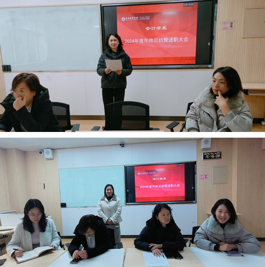西安培华学院会计与金融学院会计学系牢记校训“校誉至上、质量第一,自强不息、开拓前进”,回顾2024年度,围绕审核评估整改中期、会计学国一流专项建设、会计学ACBSP专业认证、申硕等主要工作,以评促建为第一,开拓前进建一流,2024年12月11日下午3点,会计学系2024年度述职报告会在博远楼2201智慧教室召开,会议由会计学系主任王小毅副教授主持,会计学系全体教师参会。