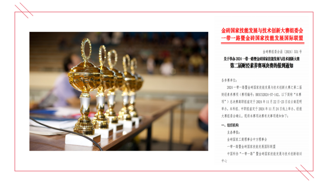 2024一带一路暨金砖国家技能发展与技术创新大赛之第二届财经素养赛项总决赛于2024年11月23日—24日在云南财经职业学院圆满落幕,本次大赛由金砖国家工商理事会中方理事会、一带一路暨金砖国家技能发展国际联盟、中国科协“一带一路”暨金砖国家技能发展与技术创新培训中心主办,旨在深入贯彻党的二十大精神和职业教育相关政策,助力职业教育高质量发展。