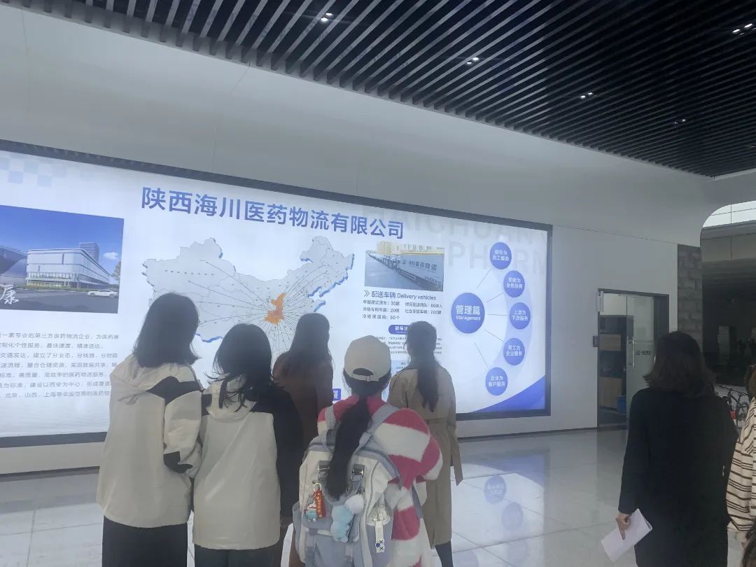 随后,师生们前往企业合作伙伴陕西海川医药物流有限公司进行参观学习。公司人力资源部王主任细致地介绍了企业经营的药品种类、产品运输流程以及先进的智能化物流系统,让学生们对企业的业务流程有了直观的了解,建立对医药产品的基本认知,明确了岗位职责和职业素养。