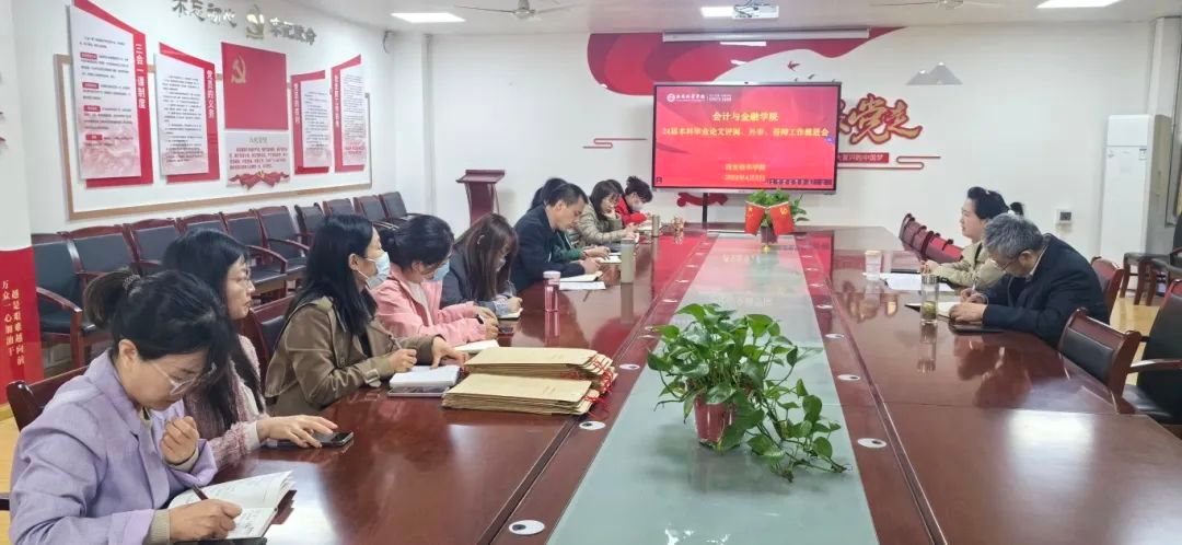 为认真贯彻落实《西安培华学院本科毕业论文(设计)工作管理办法》《西安培华学院本科毕业论文(设计)答辩工作实施细则》《关于做好2024届毕业论文(设计)评阅、外审抽检及答辩相关工作的通知》等文件精神,总结2023年本科毕业论文的抽检工作,扎实做好本科教学中的兜底工作,确保人才培养的质量, 4月2日下午,学院毕业论文(设计)评阅、外审、答辩工作推进会在博远楼2115会议室召开。会计与金融学院院长赵选民、副院长孟君以及系主任、专业论文管理教师、论文小组组长参加了会议。会议由教学干事夏金主持。