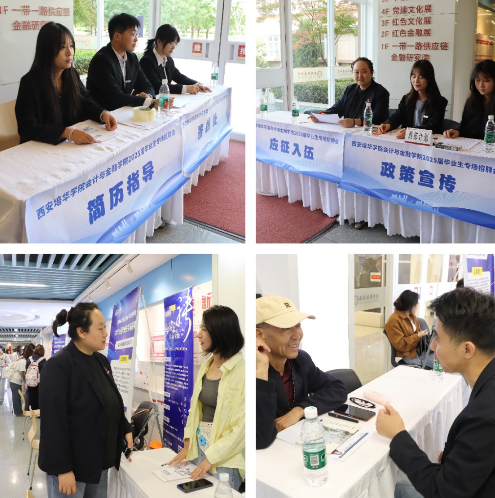为深入贯彻落实党中央、国务院关于高校毕业生就业工作的决策部署,搭建用人单位与毕业生双向选择平台,同时在学校领导和招生与就业指导中心的大力支持下,会计与金融学院于2025年4月23日上午,在西安培华学院博远楼一楼西厅内召开会计与金融学院 2025 届财经类专业专场招聘会。本次招聘会以 “校企携手” 促就业,“职” 引未来谱新篇为主题,吸引了众多知名企业参与,为毕业生提供了丰富的就业机会,开启了校企合作育人的新篇章。