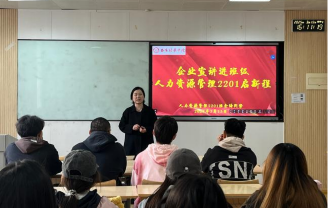 2025年3月,陕西世纪优途文化科技有限公司、陕西金烽灿网络科技有限公司、陕西雨竹秋莲建筑有限公司来到人力资源管理2201班举行了企业宣讲会。宣讲会上,各企业详细介绍了公司的业务范畴、企业文化以及提供的实习岗位等内容。本次宣讲会聚焦于让同学们深度洞悉职场需求,致力于在职业规划的道路上,为同学们提供切实有效的指引 ,帮助大家在人力资源领域找到方向,开启理想职业之旅。