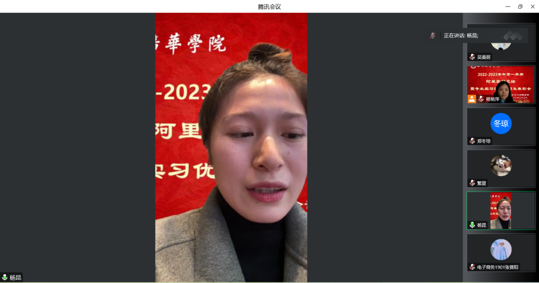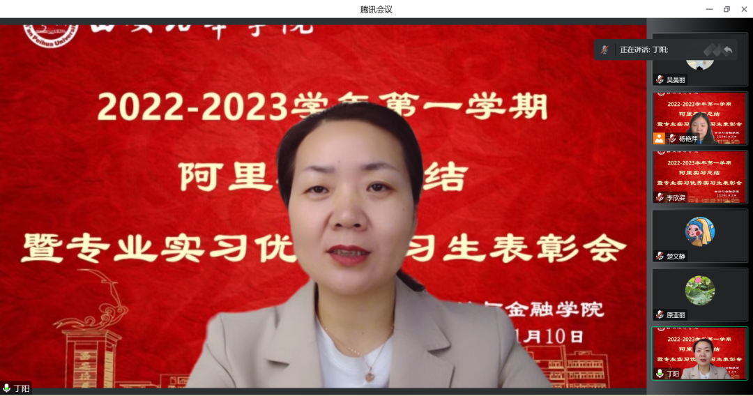 会计与金融学院数智营销系、经济系师生于2023年1月10日下午16时于腾讯会议召开阿里项目实习总结暨专业实习优秀实习生表彰会,会议由市场营销专业杨艳萍老师主持,与会邀请了产学研副院长丁阳教授、数智系主任李亚子教授,副主任刘茹岚老师、市场营销、电子商务、金融工程及国际贸易专业实习负责老师,参与本次实习的其他指导老师及全体学生。