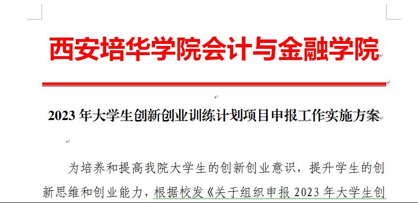 为培养和提高我院大学生的创新创业意识,提升学生的创新思维和创业能力,根据校发通知的有关要求,秉承“兴趣驱动、自主实践、重在过程”的原则,会计与金融学院部署开展了“2023年大学生创新创业训练计划”项目申报工作。制定2023年大学生创新创业训练计划项目申报工作实施方案。