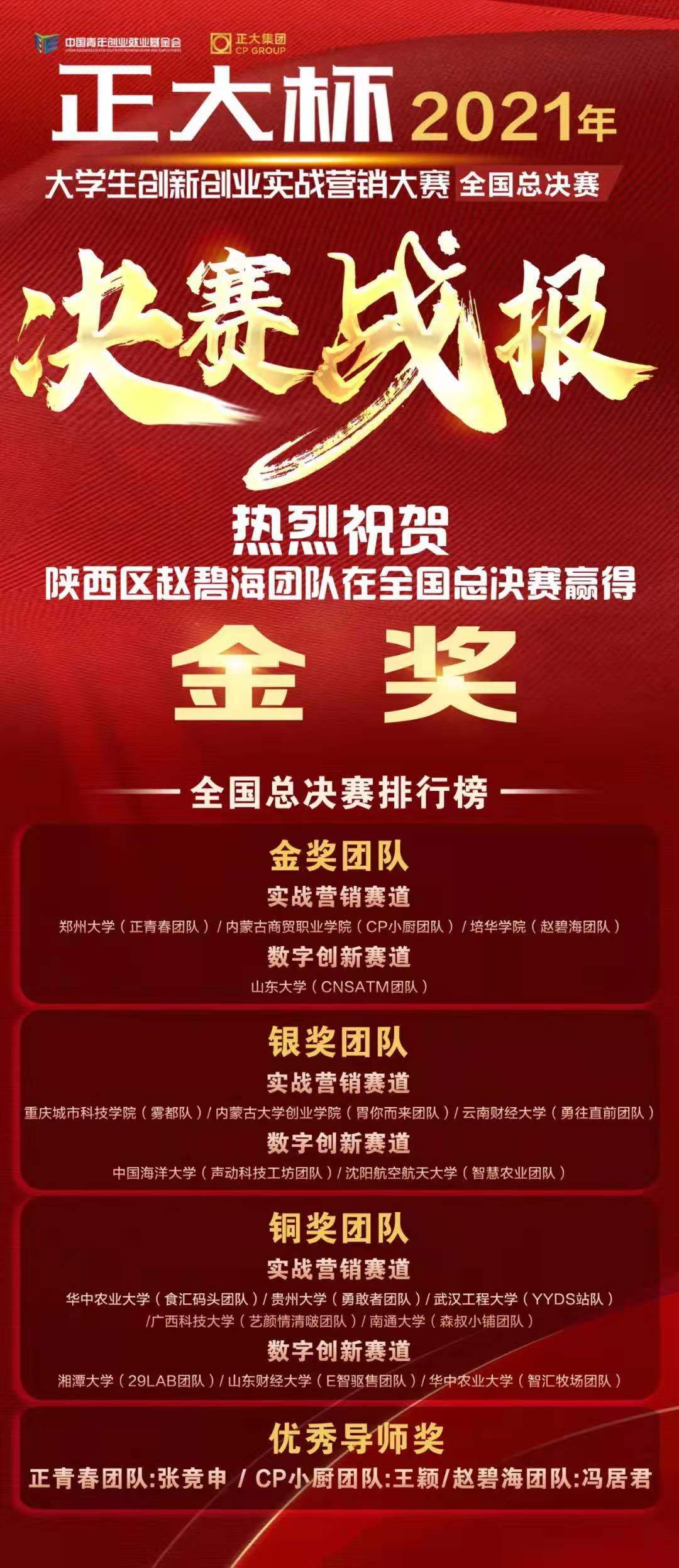 祝贺会计与金融学院“赵碧海”团队荣获“正大杯”2021年大学生创新创业实战营销大赛总决赛金奖