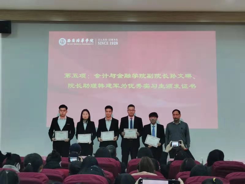 大会第四项,由会计与金融学院副院长杨仕鹏和院长助理韩建军给优秀实习生颁发证书。