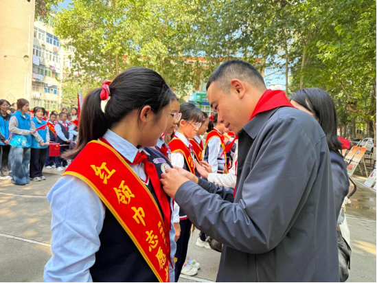 活动伊始,航天二一〇小学的少先队员为党员师生佩戴红领巾,学生党员则回赠“小小志愿者”徽章,让红色基因在互动中传承,进一步坚定理想信念。