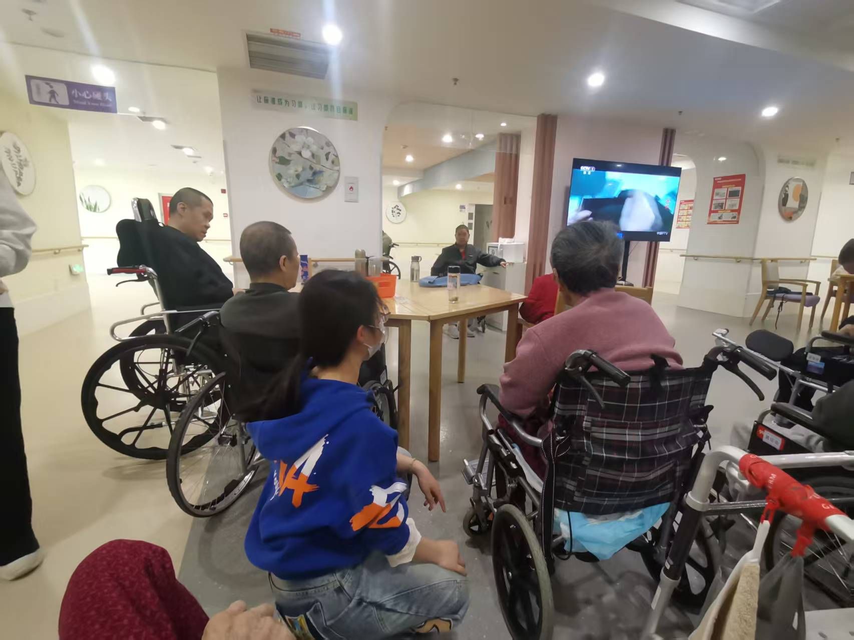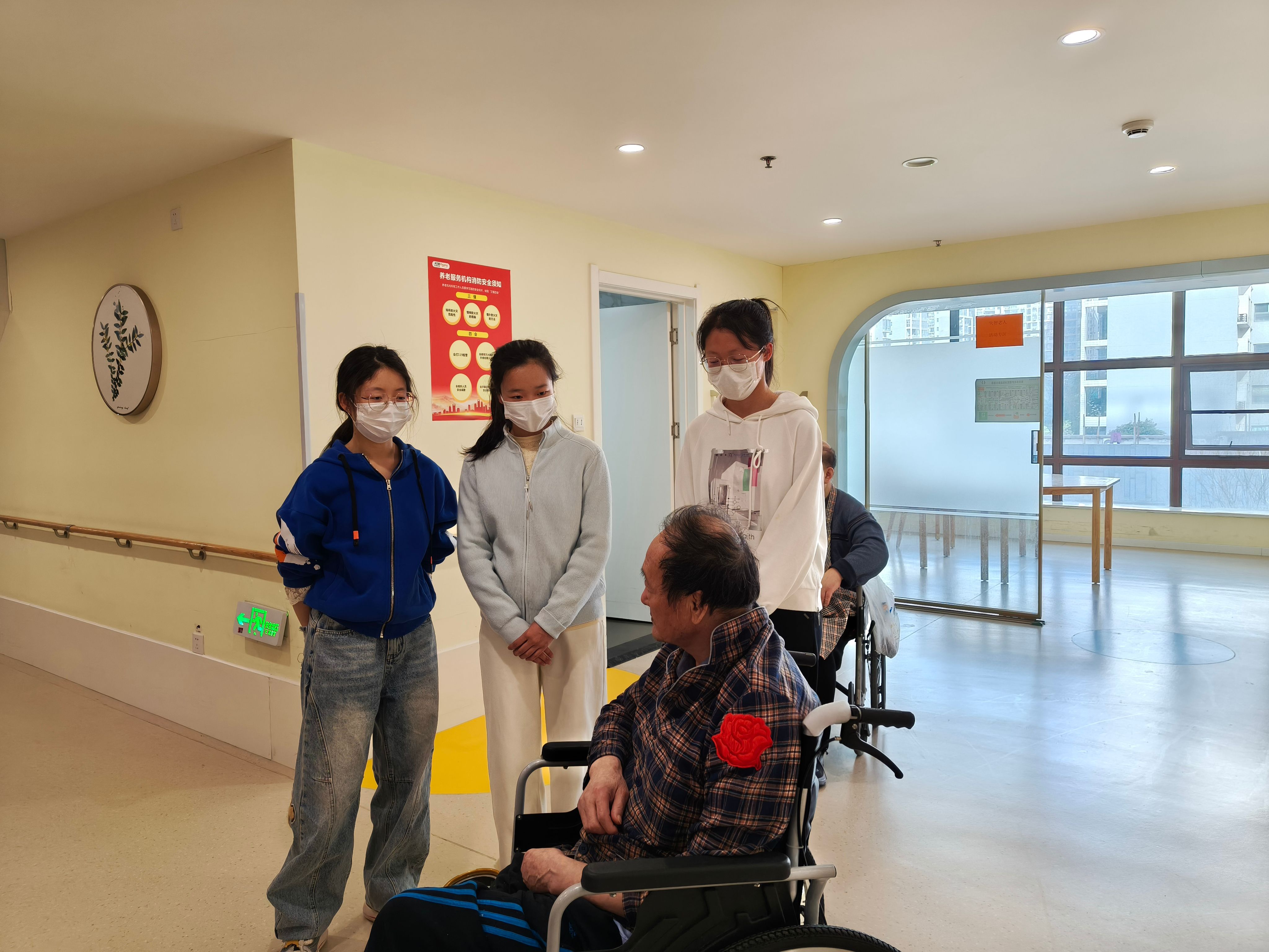 3月23日下午,学生第一、第二党支部10名志愿者走进康源养老·西安雁塔护理院,开展“温情陪伴”志愿服务活动。志愿者们分工协作,有的拿起扫帚、抹布,细致清理走廊与房间卫生;有的蹲坐在老人身旁,一边揉肩捶背,一边倾听他们讲述往事;还有的陪老人散步、下棋,组织趣味小游戏,院内欢声笑语不断。