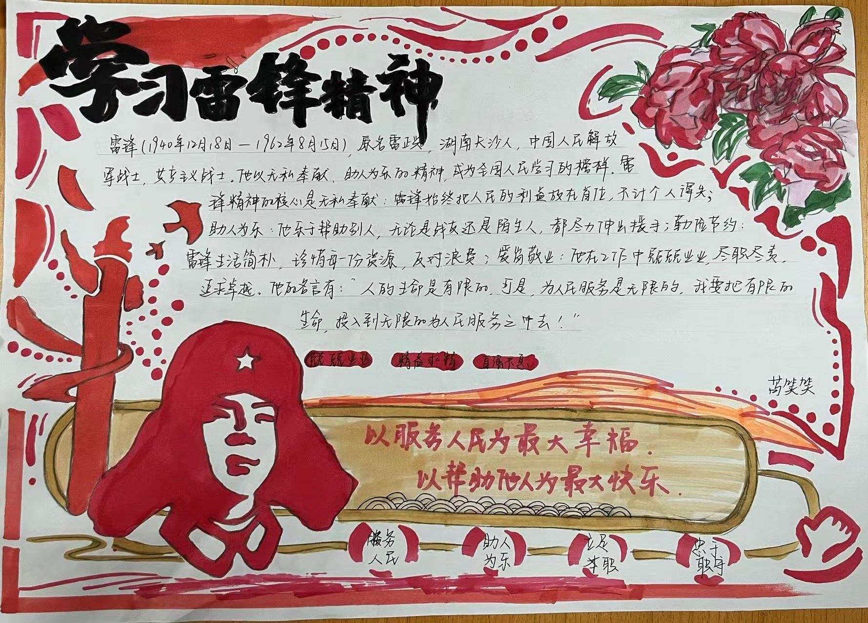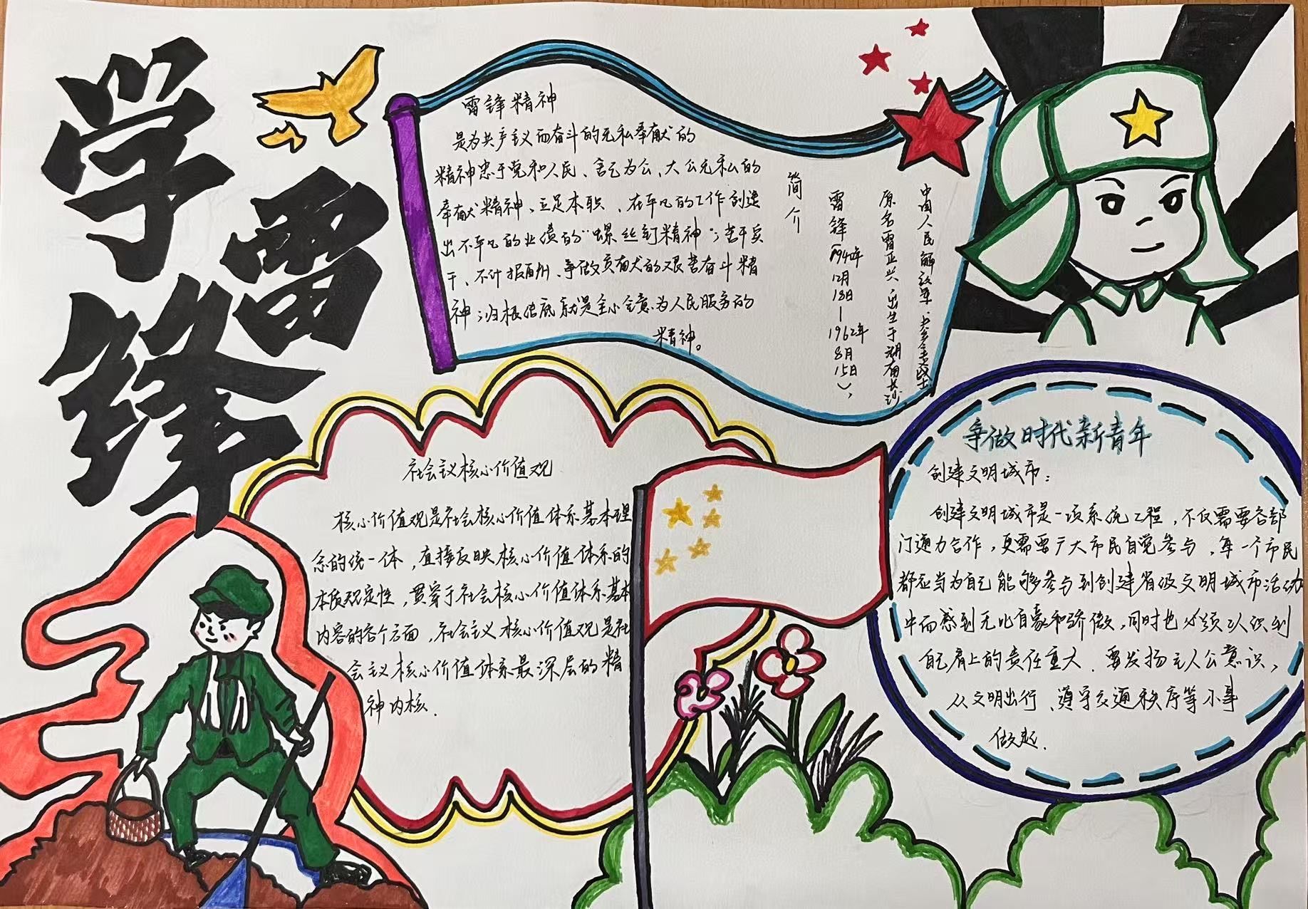 活动期间,大家在一张张手抄报上描绘出对雷锋精神的理解与感悟。有的同学通过生动的插画展现雷锋做好事的场景,有的则用工整的文字阐述雷锋精神的内涵,还有的分享了身边的雷锋式人物事迹。这些手抄报内容丰富、形式多样,不仅体现了同学们对雷锋精神的深刻领会,更展示了新时代青年积极向上的精神风貌