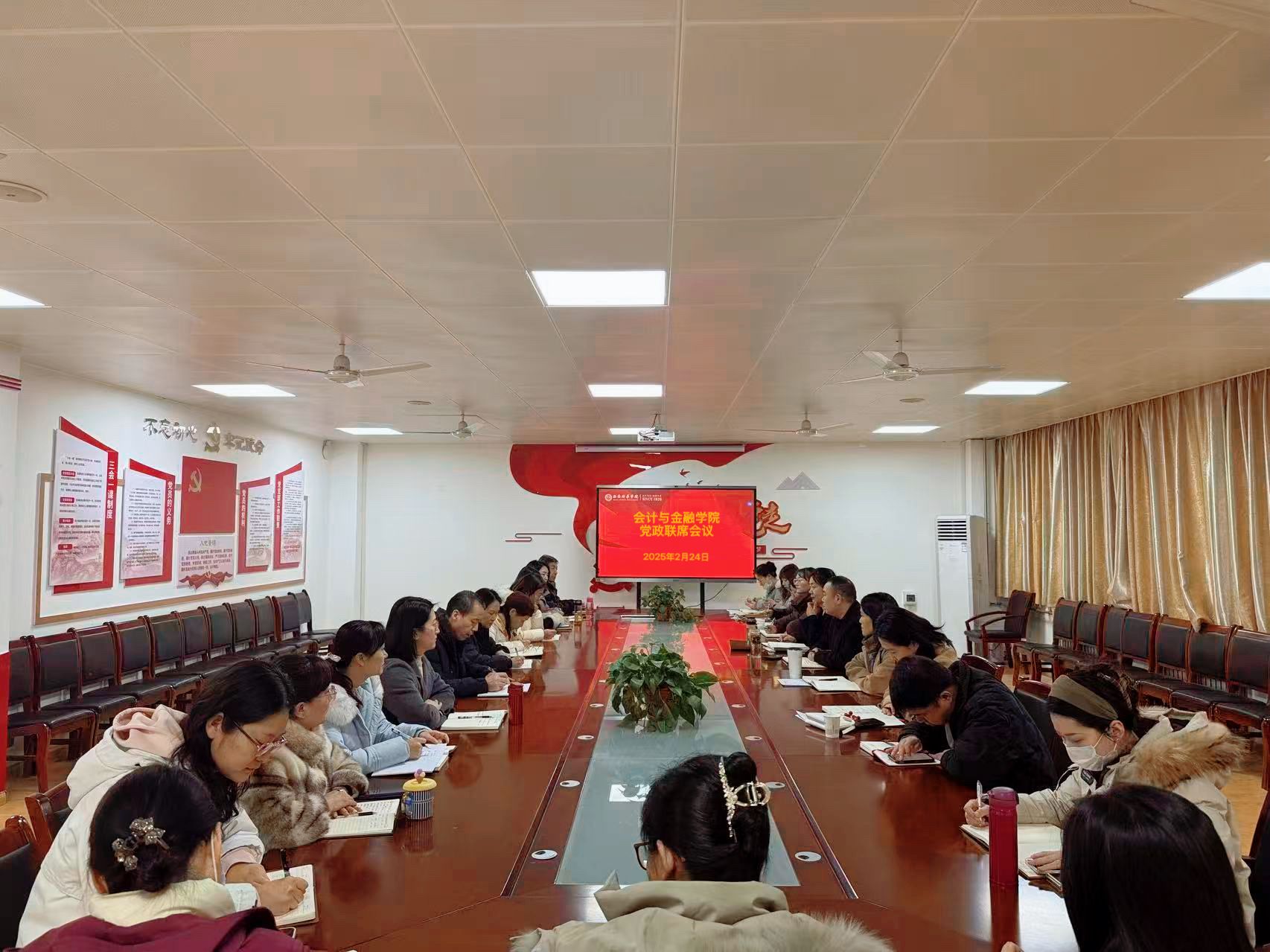 为统筹部署新学期党政重点工作,明确发展方向,凝聚协同奋进力量,2025年2月24日,西安培华学院会计与金融学院在博远楼2115会议室召开2025年第一次党政联席会议。参会领导包括:会计与金融学院院长蔡敬梅、党委书记兼行政副院长刘斌、副院长孟君、副院长丁阳、党委副书记高乐、周嫚,会议由学院党委书记兼行政副院长刘斌主持。