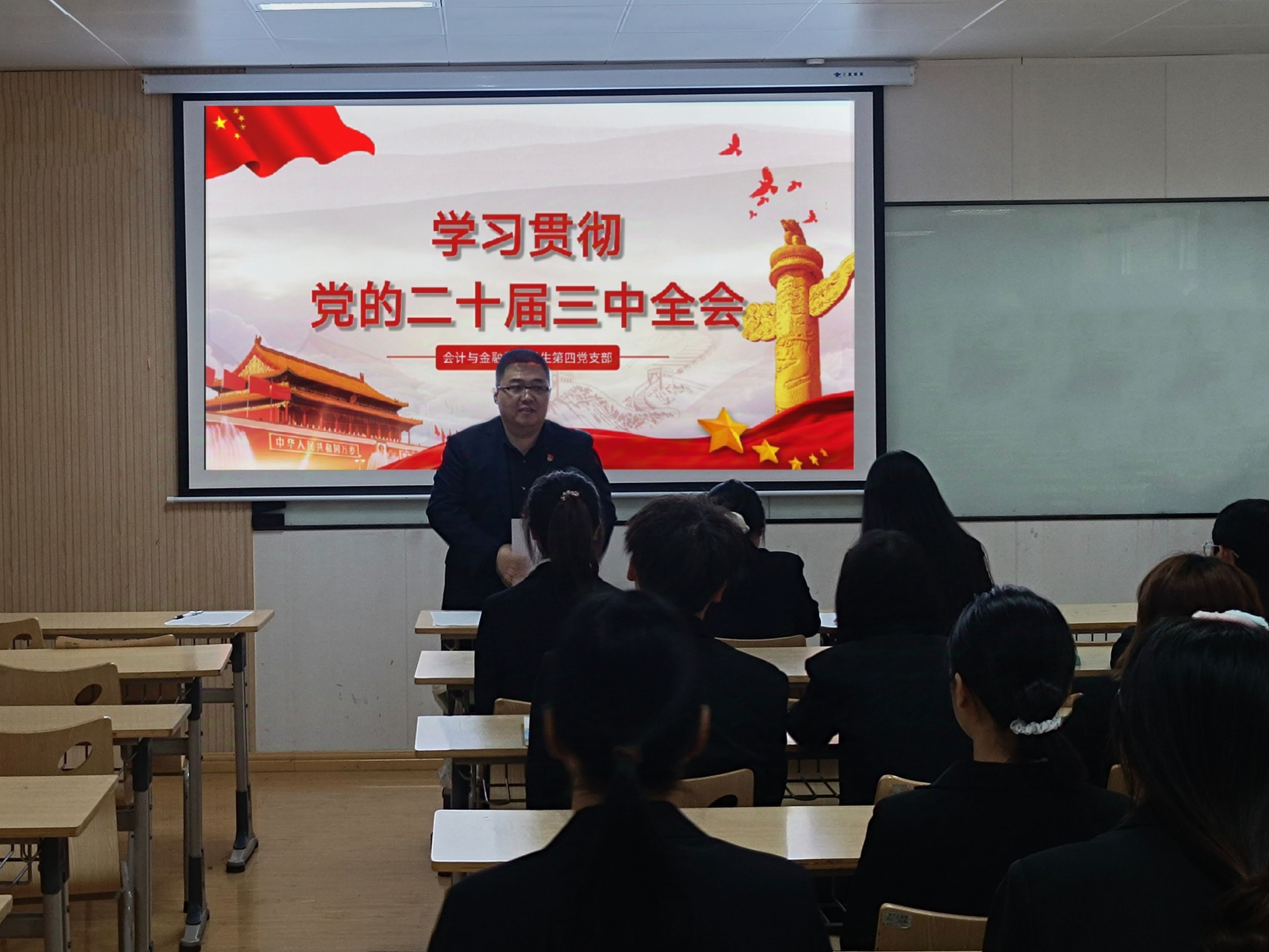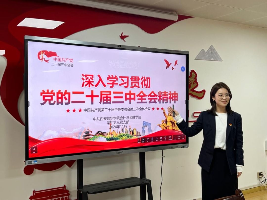 会计与金融学院学生第三党支部于博远楼2115会议室开展以“深入学习贯彻党的二十届三中全会精神”为主题的支部书记讲党课活动。支部书记李梦丽老师围绕“全面深化改革”进行了详尽阐述,深刻剖析了新时代在党的带领下社会的发展与前行道路。同时解读了《中共中央关于进一步全面深化改革、推进中国式现代化的决定》中的关键信息,强调了党员干部们在当前的大背景下,必须时刻保持清醒的政治头脑,坚定党的领导方向,贡献自己的力量。