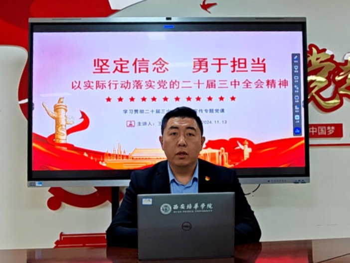会计与金融学院学生第一党支部书记王迪老师开展了主题为“坚定信念、勇于担当——以实际行动落实党的二十届三中全会精神”的讲党课活动。王老师带领大家学习了党的二十届三中全会的“三个意义”。通过生动的事例和深刻的理论分析,全面把握党的二十届三中全会的“三个重点”。让党员们深刻认识到坚定的信仰是共产党员的精神支柱和力量源泉,从而深入贯彻党的二十届三中全会的“三个坚持”。