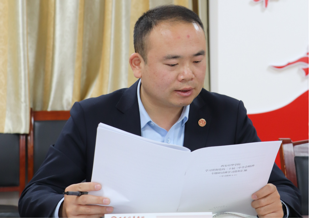 会议在下午14:00准时开始,首先由会计与金融学院党委书记兼行政副院长刘斌领学“中国共产党第二十届中央委员会第三次全体会议公报”,他详细解读了全会的主要成果和重大意义,强调了全会对于全面建设社会主义现代化国家、全面推进中华民族伟大复兴的指导作用。