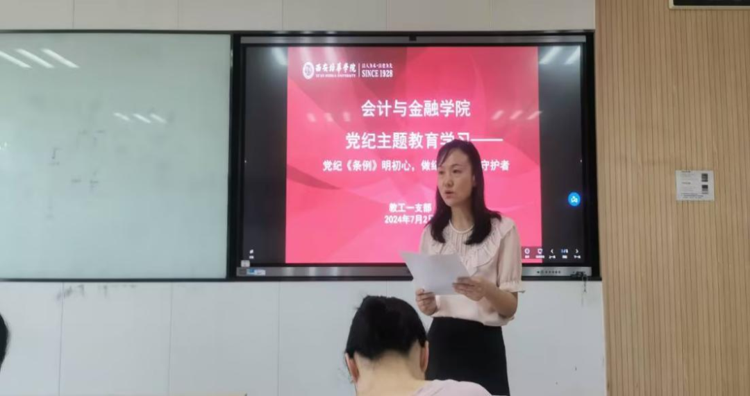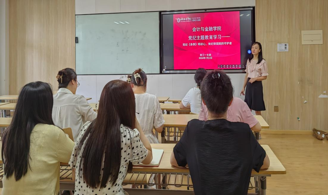 2024年7月2日下午14:30,教工一支部在2118多媒体教室召开党纪学习教育——党纪《条例》明初心,做纪律规矩的守护者会议。参加本次会议的有会计与金融学院教工一支部书记李亚子、会计与金融学院党务干事朱梦阳、会计与金融学院实验室主任张小妮老师以及全体教工一支部党员教师。