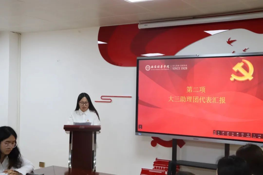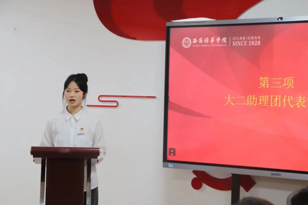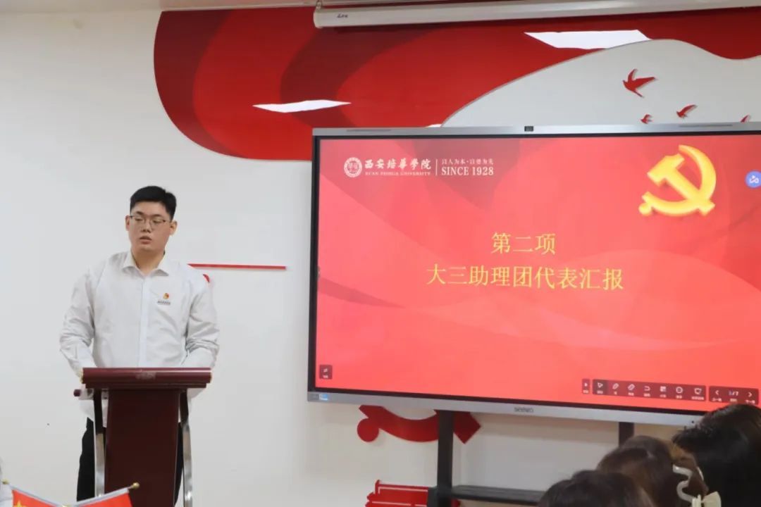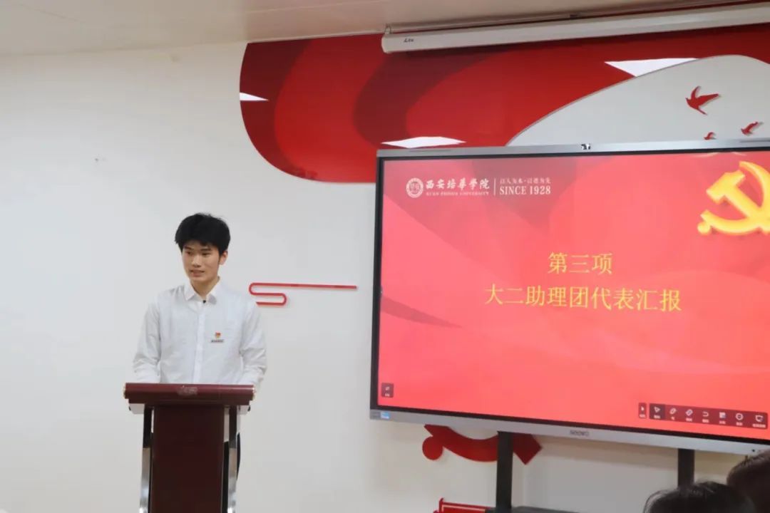 大三助理团中心组成员赵庆辈和助理团成员温迪代表发言。在过去的时间里,他们发挥着先锋模范作用,以高度的责任感和使命感积极投身到新生的思想政治教育,学习党纪教育方面等各项工作中。用自己的实际行动诠释了共产党员的初心和使命,为同学树立了良好的榜样,他们表示,在未来的工作中也将会不断关注我院党内事务,也希望更多优秀学子的涌入为会金党委注入新鲜血液。