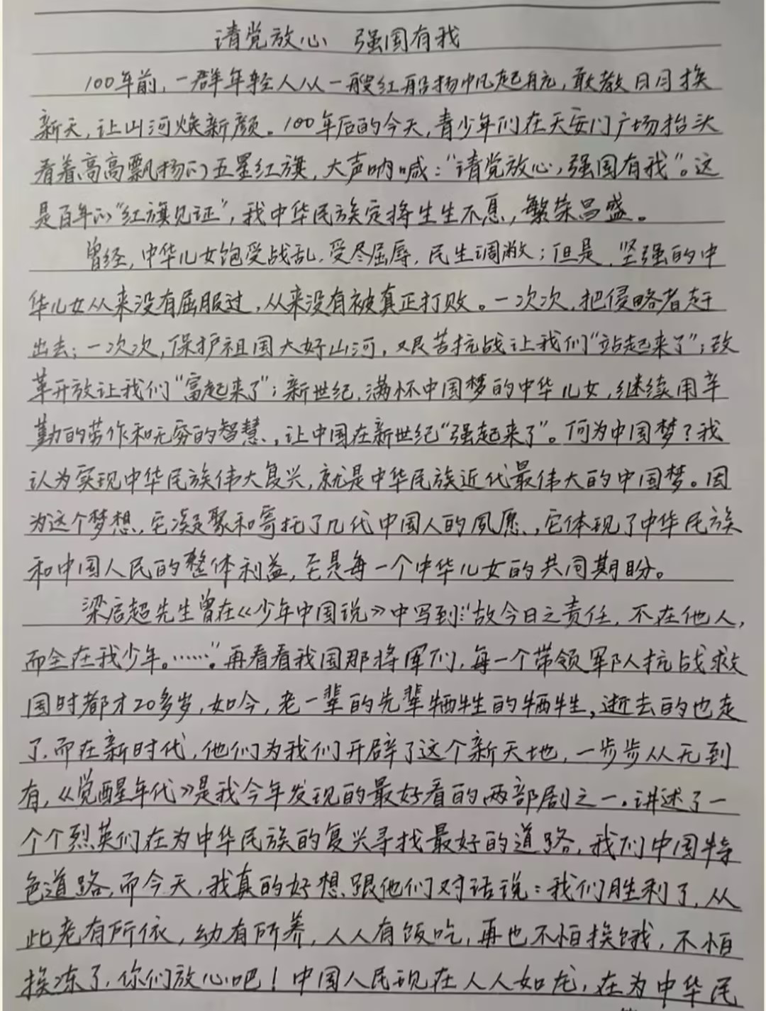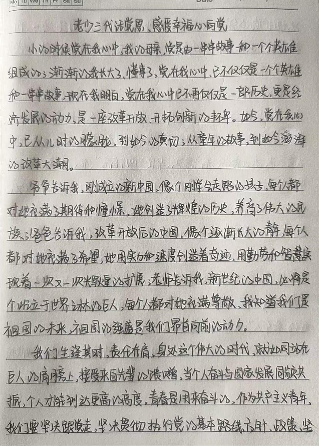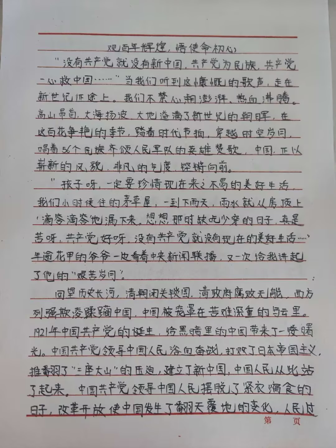 笔下生乾坤,各有千百色,同学们紧紧围绕本次活动主题,笔走龙蛇,一篇篇精彩的文章便跃然纸上,字里行间满是对党和国家的热爱和感激,爱国之情溢于言表。