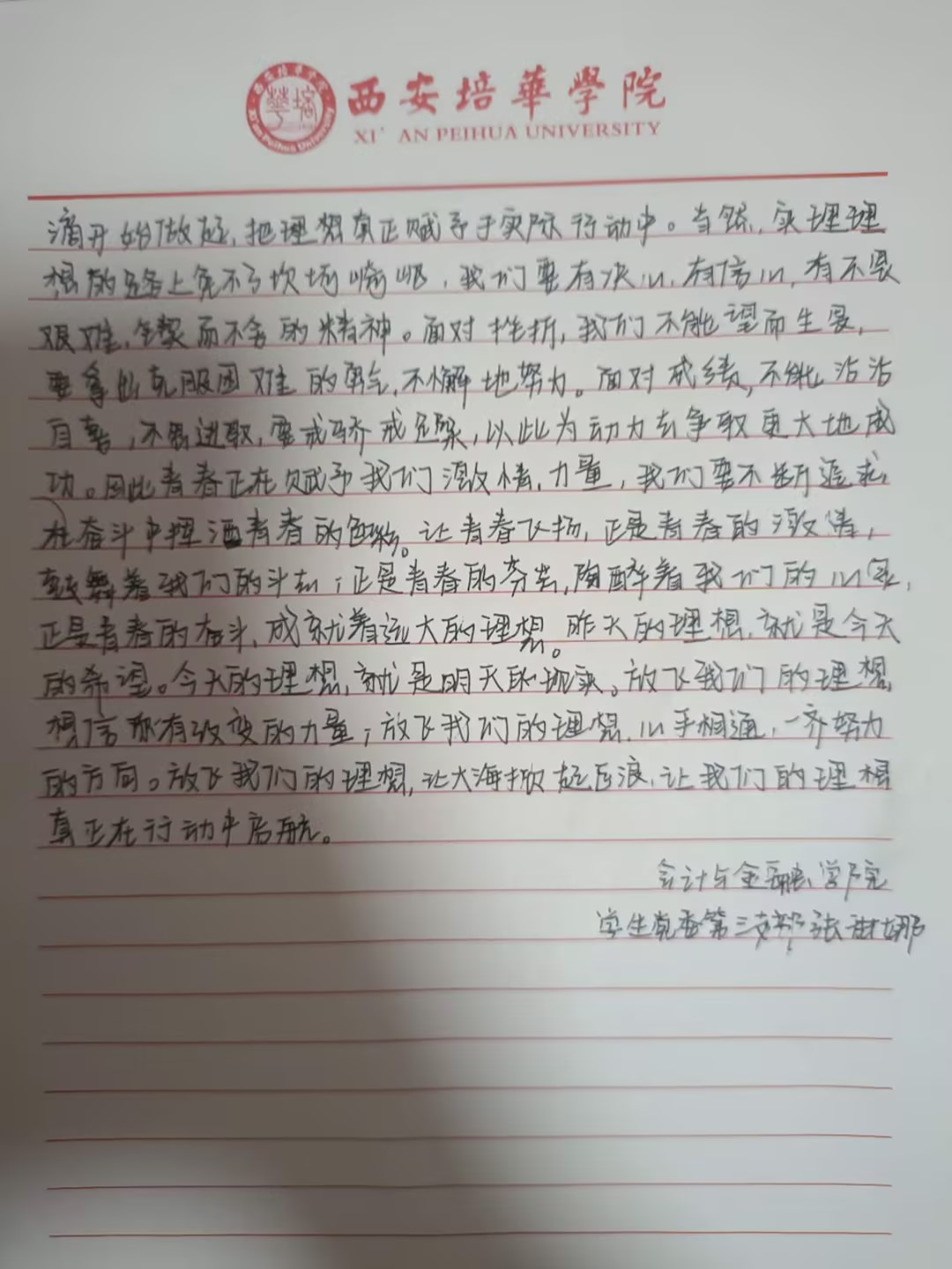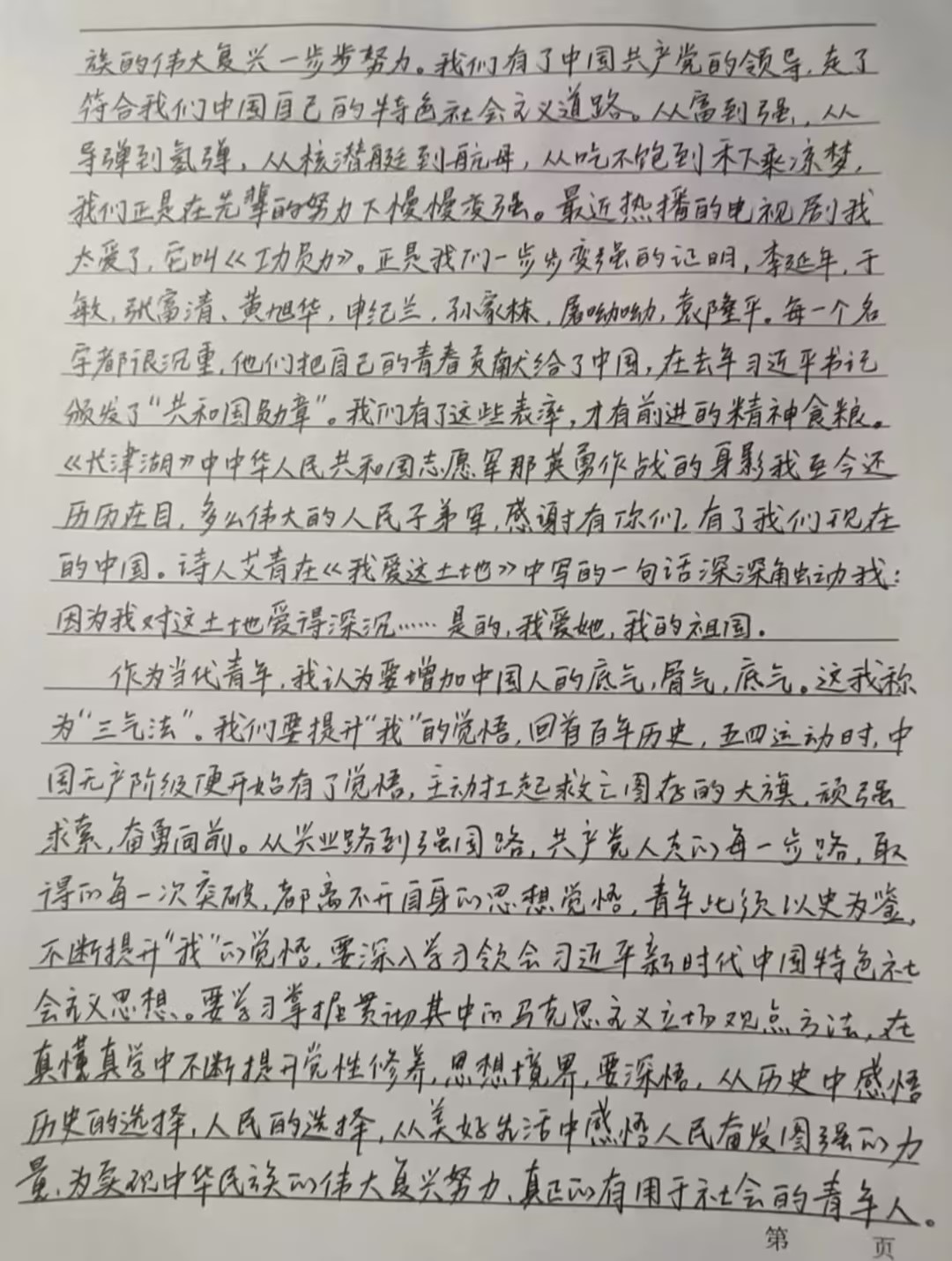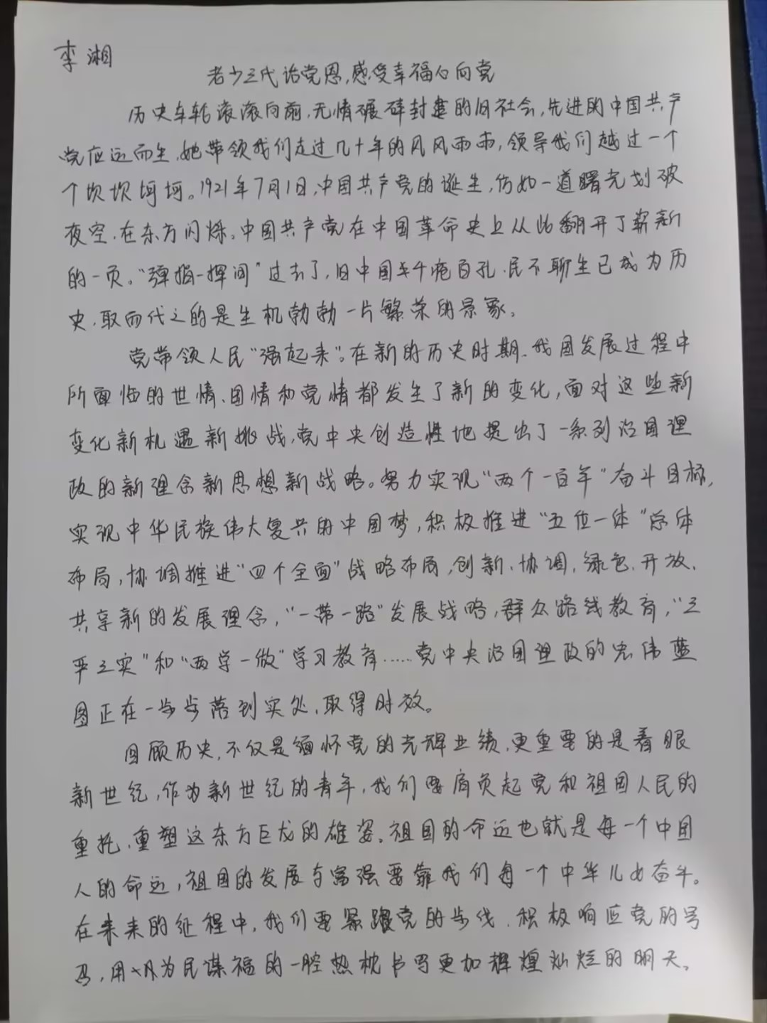 笔下生乾坤,各有千百色,同学们紧紧围绕本次活动主题,笔走龙蛇,一篇篇精彩的文章便跃然纸上,字里行间满是对党和国家的热爱和感激,爱国之情溢于言表。