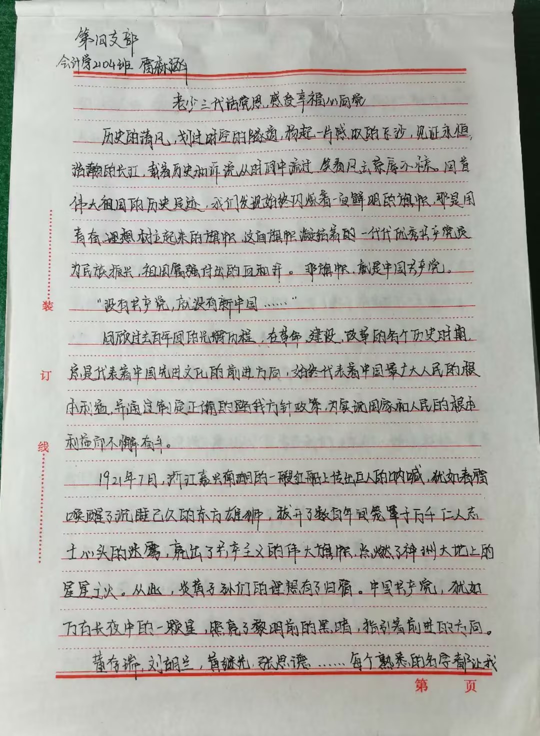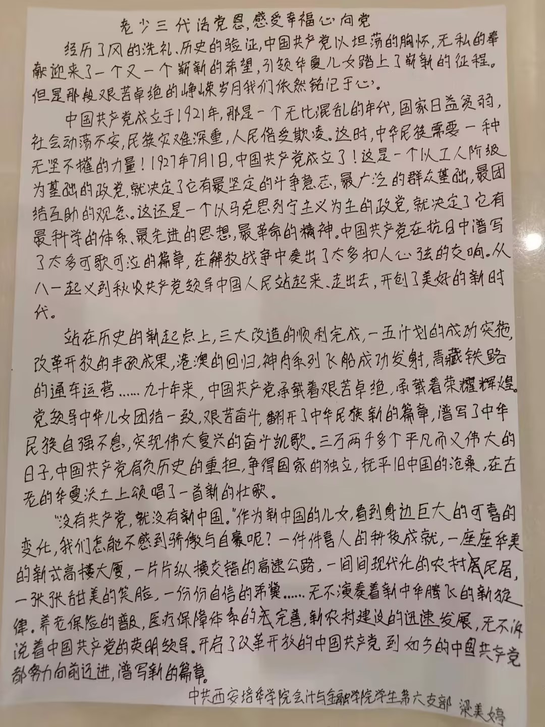 为深入学习贯彻习近平新时代中国特色社会主义思想,激励我院学生党员发扬党的优良传统,传承党的良好精神品质。2023年8月,会计与金融学院党委特举办“老少三代话党恩,感受幸福心向党”主题征文比赛活动,我院各学生党支部成员积极参与。