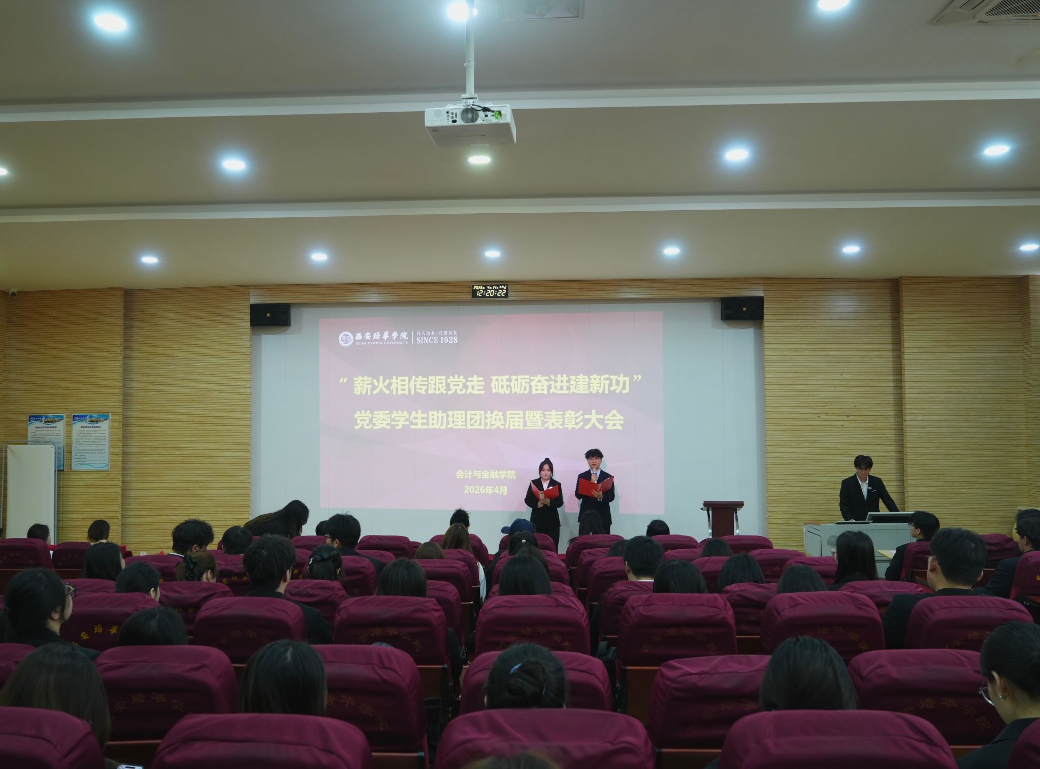 为进一步加强学生骨干队伍建设,传承优良工作作风,激发学生党员干部的责任与担当,会计与金融学院于4月14日中午12:15,在博远楼J201阶梯教室,召开了“薪火相传跟党走,砥砺奋进建新功”党委学生助理团换届暨表彰大会。学院党委书记兼行政副院长刘斌、党务行政干事朱梦阳、党务专干孙宝丽、学生党支部书记赵娅囡、张超、李梦丽出席本次大会,2023级、2024级党支部学生助理团成员参会,会议由罗鸿洋、徐雨萱主持。