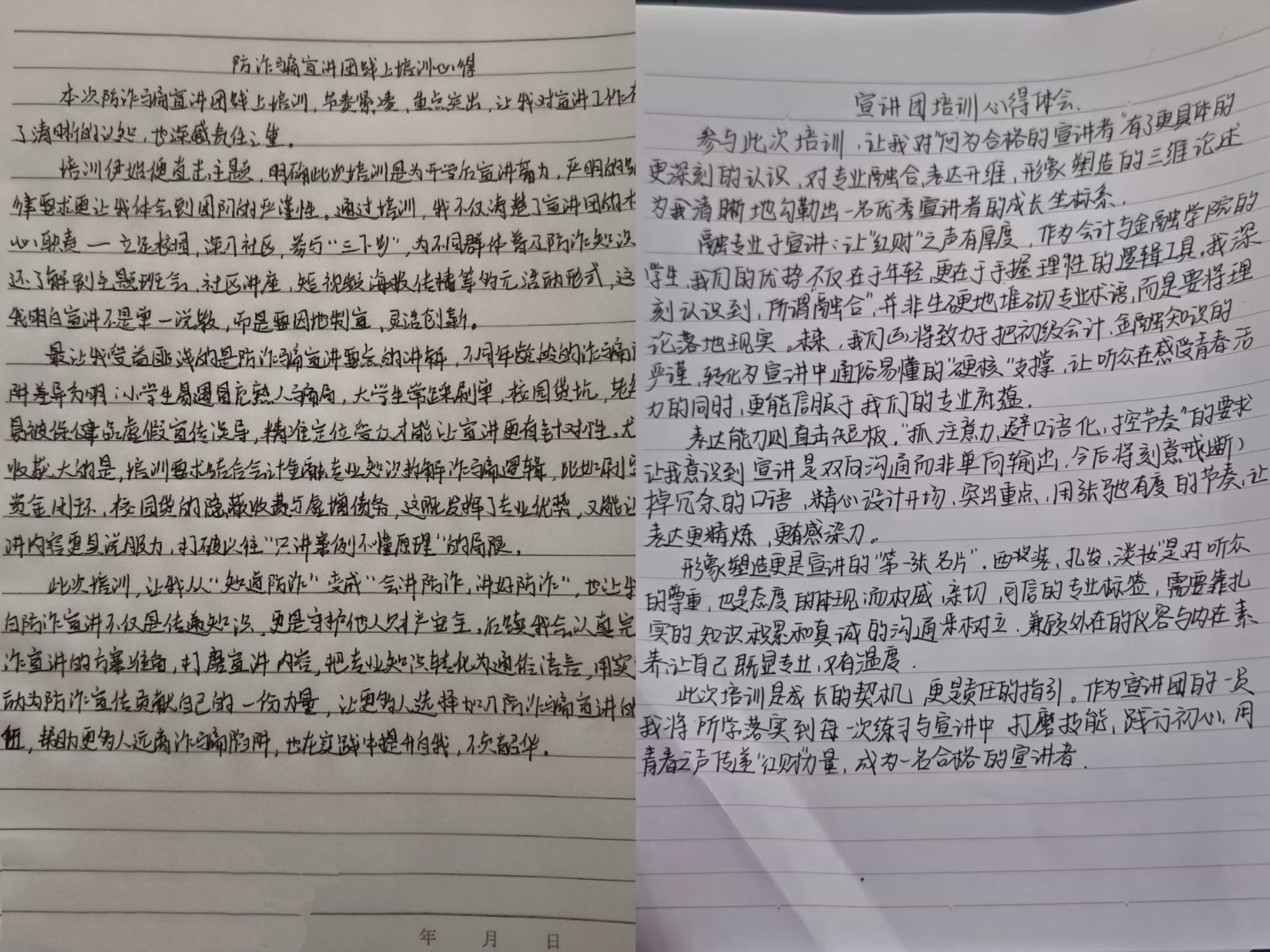 五场培训层层递进、环环相扣,从理论到实战、从内容到形象,全方位提升了宣讲团成员的专业素养与表达力。未来,会计与金融学院宣讲团将以专业为基、宣讲为翼,走进校园、深入社区、投身“三下乡”,传递红色财经力量与反诈知识,展现会计与金融学院学子的专业底气与青春风貌,为筑牢全民反诈防线贡献力量。