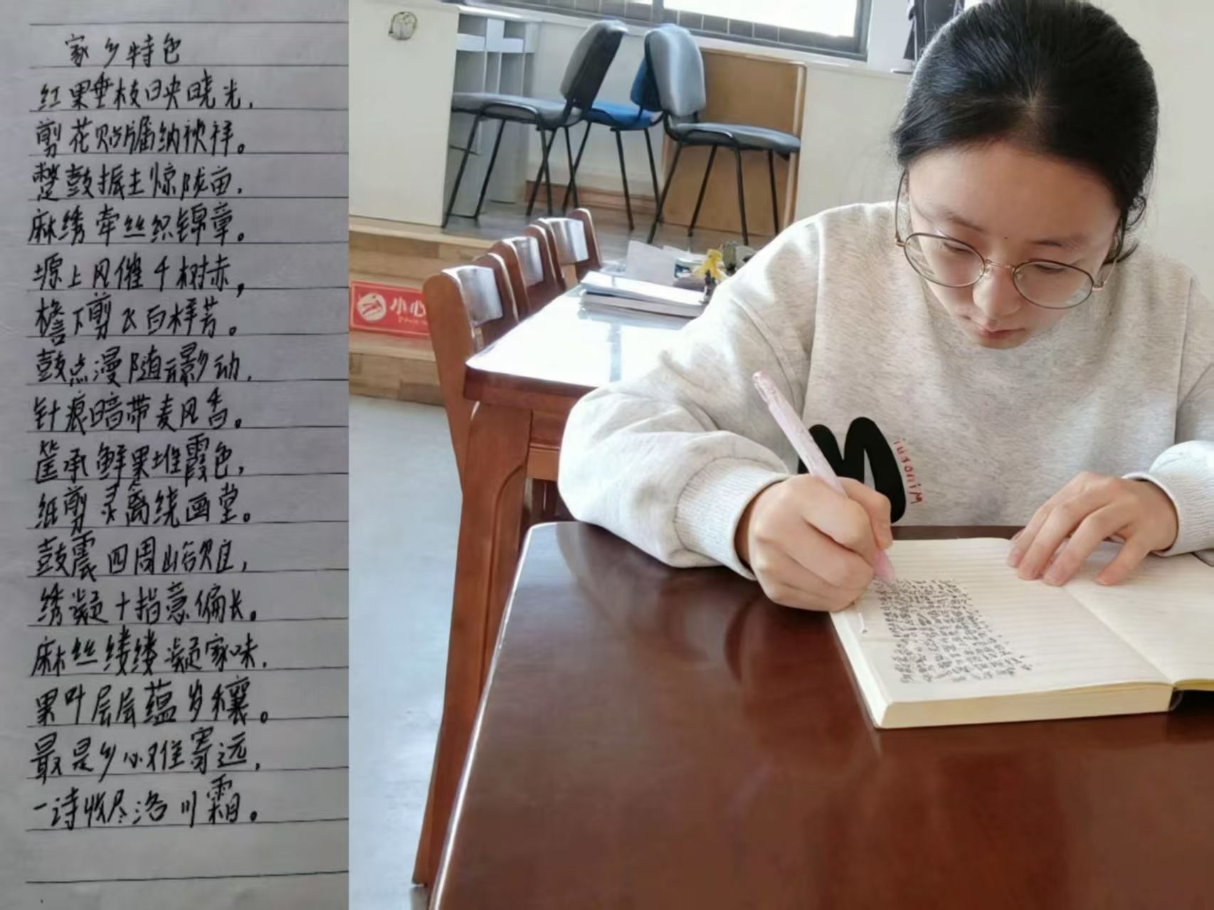 心得体会:在创作《家乡特色》这首诗的过程中,我深深体会到“源于生活,归于真情”的创作真谛。捕捉家乡洛川最鲜活的特质;探访农家小院,看剪纸艺人指尖生花;倾听塬上威风锣鼓,感受那穿透黄土高原的震撼。这些鲜活的场景成为诗句的血肉:“红果垂枝映晓光”是清晨果园的第一缕阳光,“剪花贴牖纳祯祥”是腊月里温暖的年俗。我试图用“麻绣牵丝织锦章”将针线的温度融入文字,用“鼓震四周山欲应”让读者听见锣鼓的轰鸣。当诗句从零散的意象串成完整的篇章,我明白好的文字不仅是技巧的堆砌,更是对家乡的深情告白。这次实践让我懂得,唯有沉下心去感受生活的肌理,才能让笔下的文字带着泥土的芬芳与烟火的暖意,真正走进人心。