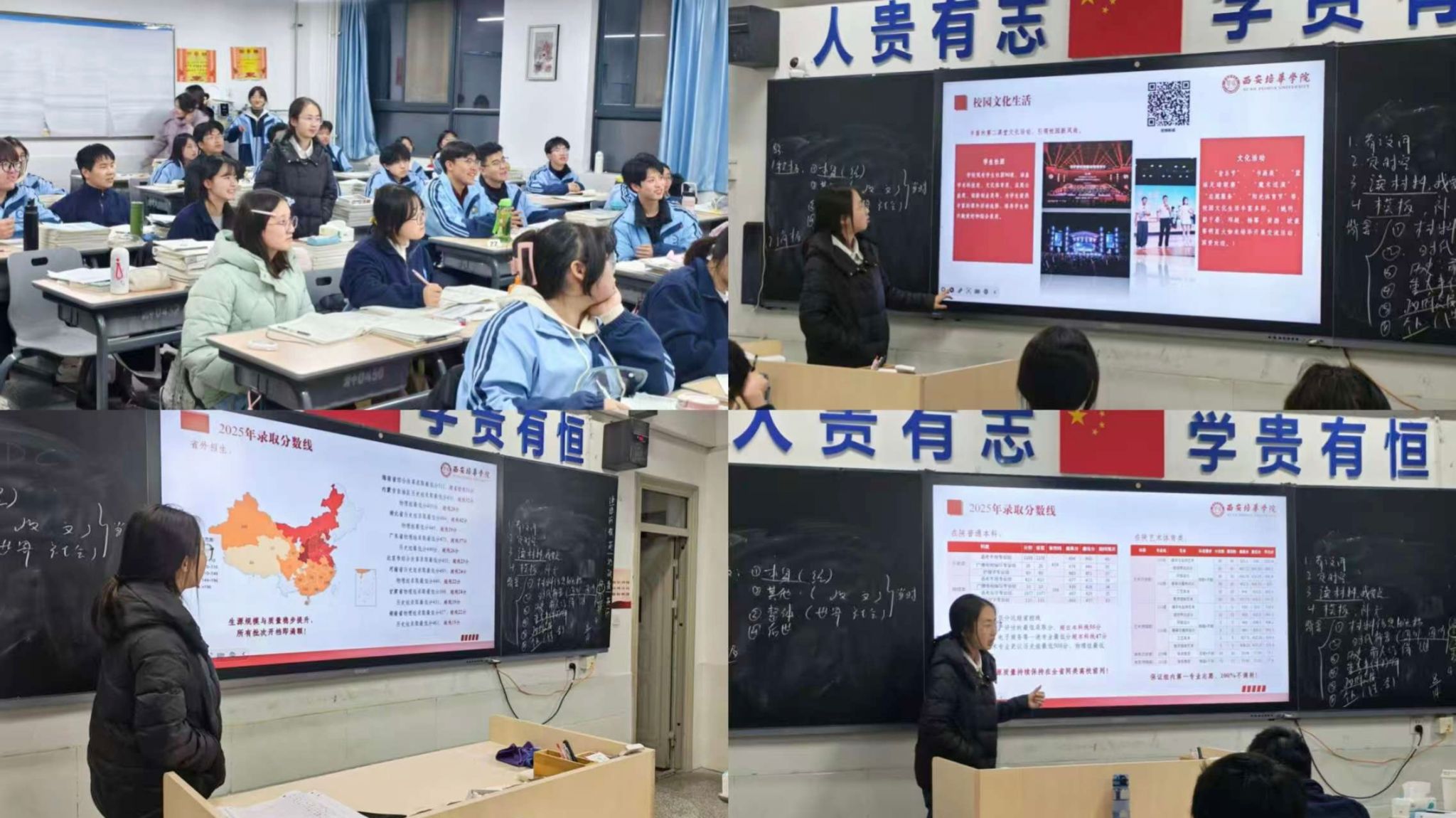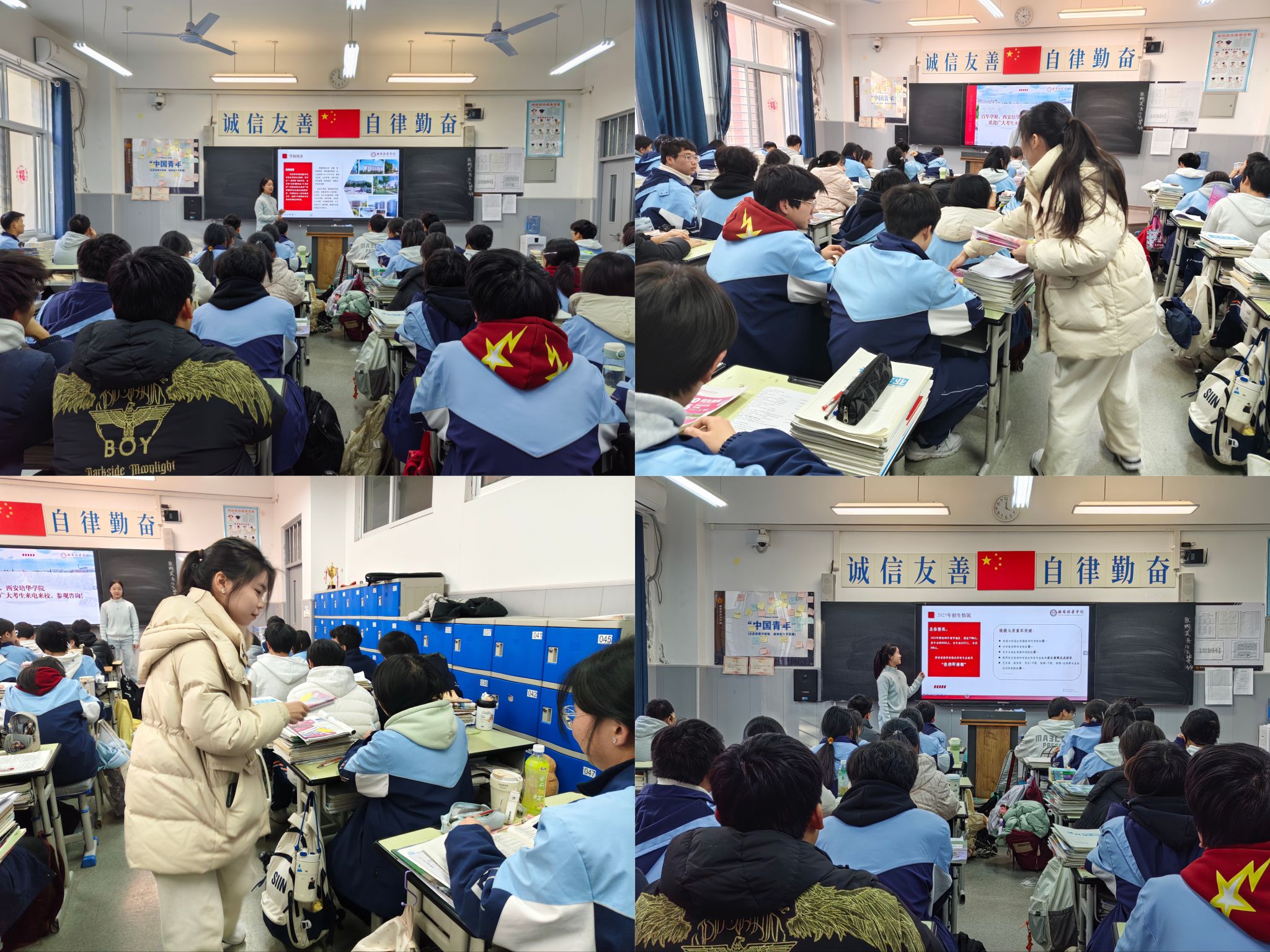 随后的宣讲活动在高三班级拉开帷幕,主讲人雍若彤同学以“我的培华成长记”为切入点,通过精心制作的PPT与校园宣传片,全方位展示西安培华学院办学底蕴、学科优势、校园文化与就业前景。从百余年办学历史的文化积淀,到现代化的教学设施与实训平台;从特色专业课程设置,到创新创业实践与奖学金政策,生动的案例与详实的数据,让学弟学妹们对大学生活充满向往。