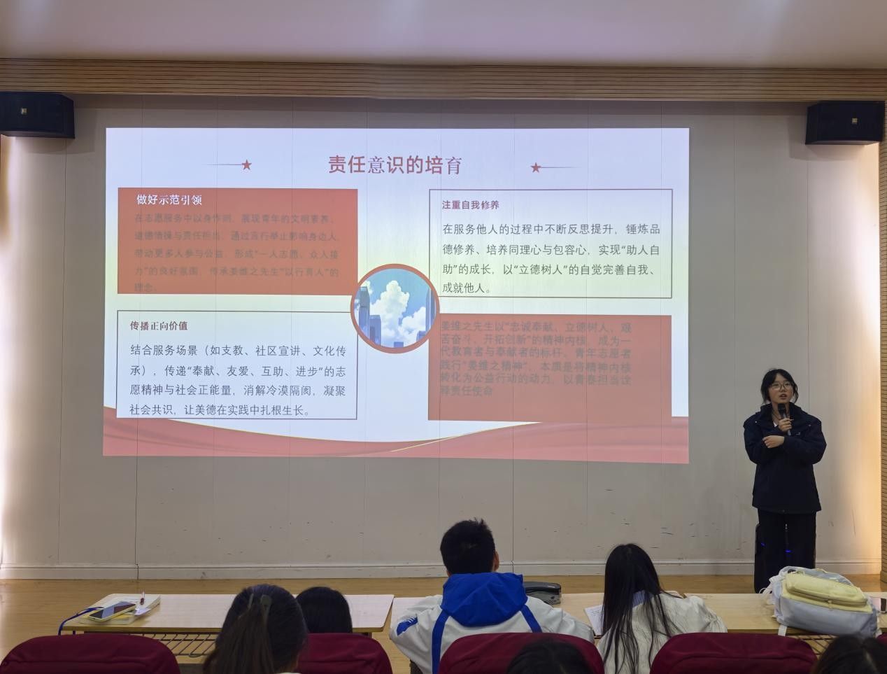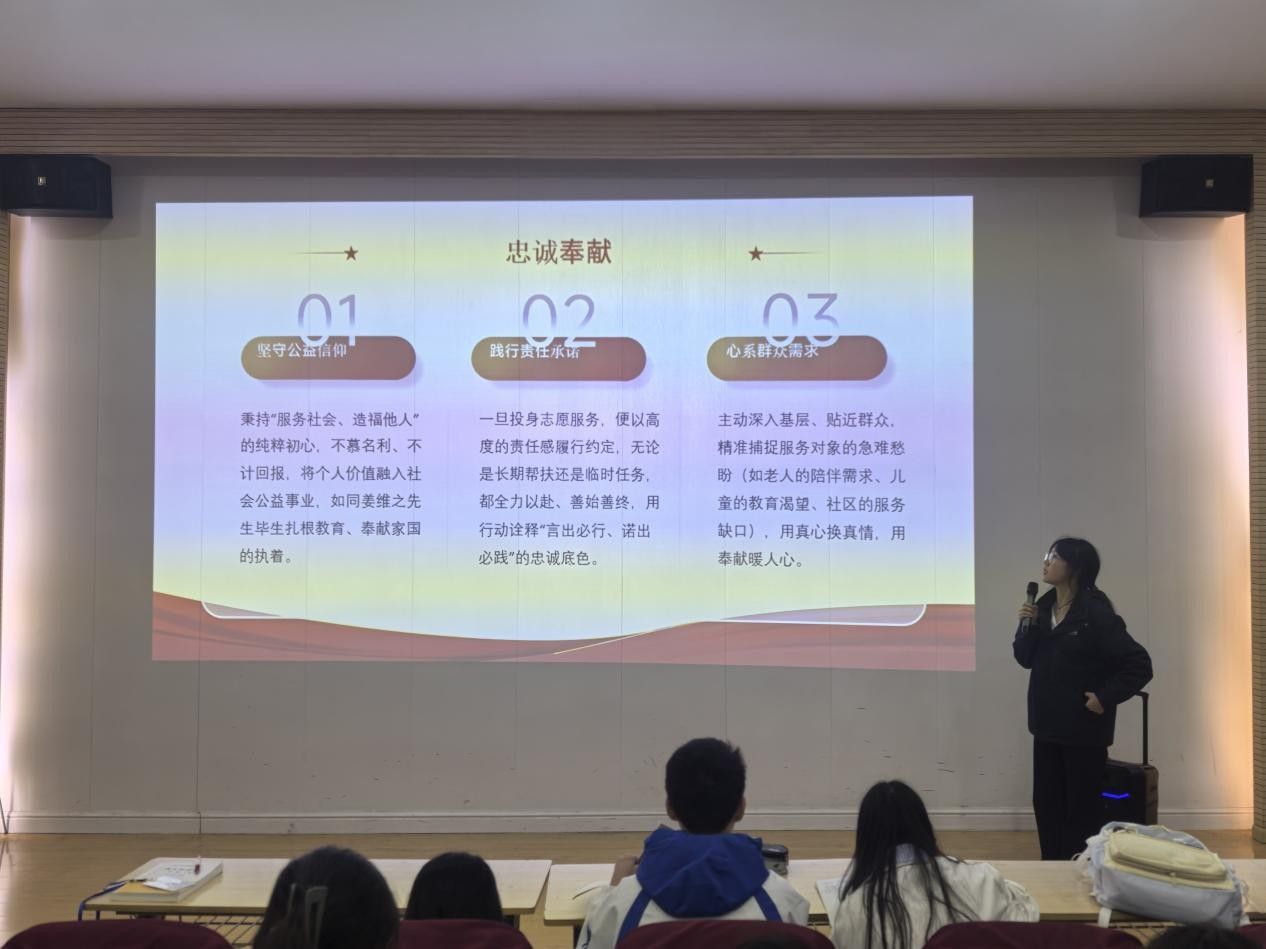 培训围绕“忠诚奉献”与“立德树人”两大核心主题展开。在“忠诚奉献”环节,主讲人通过讲述姜维之先生毕生奉献教育事业的感人事迹,引导青年志愿者树立“服务社会、造福他人”的纯粹初心。培训强调,志愿服务要立足基层实际,精准把握服务对象需求,在实际行动中践行责任担当,将个人价值融入社会公益事业。
