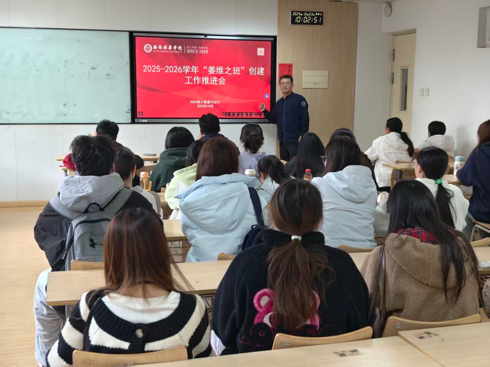 2025会计学(专升本)02班召开本学年“姜维之班”创建推进会,45名同学全员到场,班委牵头主持,电子屏显示“凝心聚力抓推进,对标对表促落实”主题。会上,学习委员汇报“会计实操技能小组”组建进展,指出部分小组协作效率不足;同学们以小组为单位,围绕“姜维之精神融入日常学习”“下月志愿服务策划”讨论建言。班长汇总方案,明确下一阶段完成2次技能模拟训练、提升竞赛报名人数,45名同学当场签署任务认领表,推动班级从“启动创建”向“实质推进”转变,为后续工作筑牢基础。